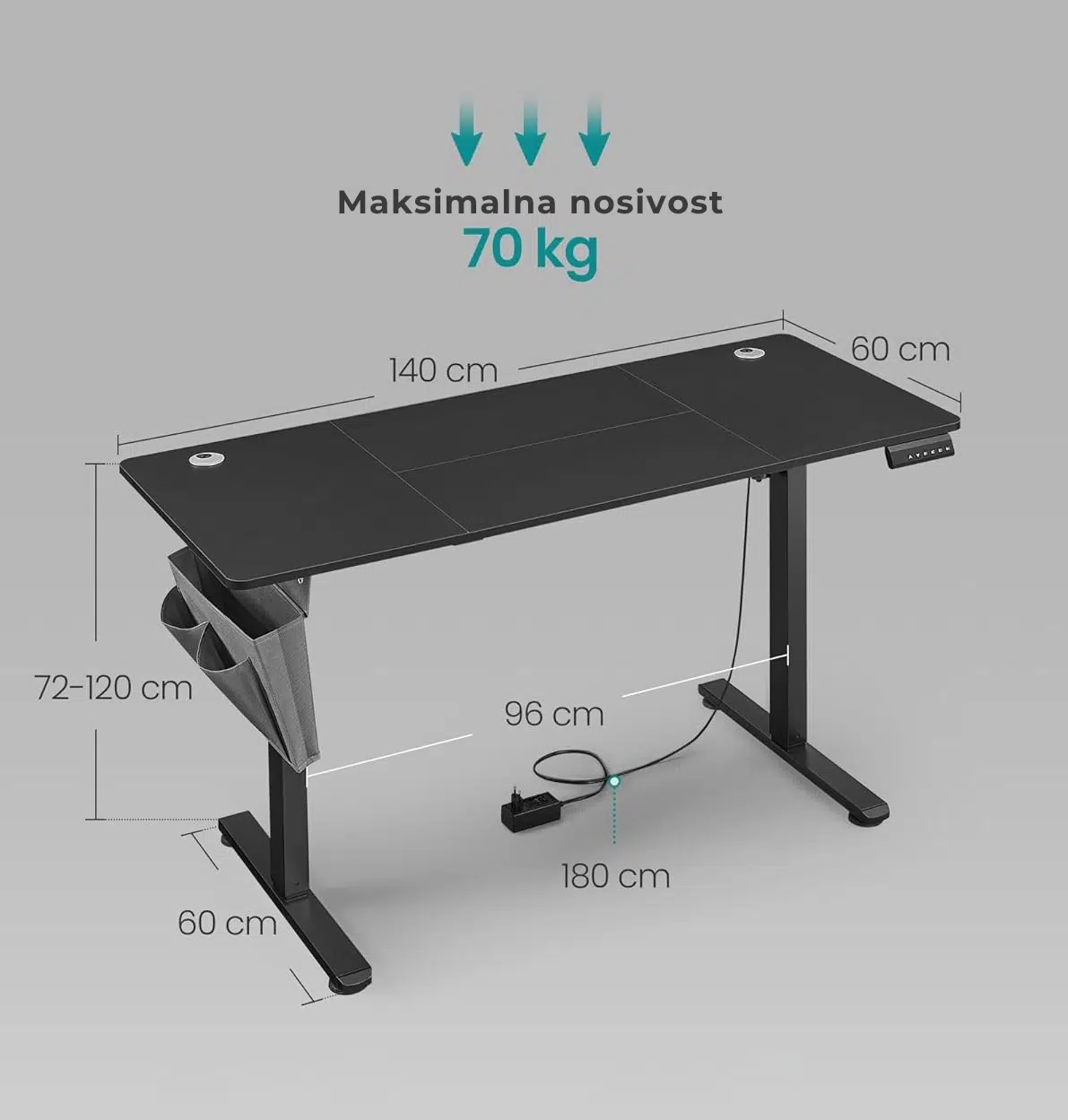 Sa velikom radnom površinom 160 × 70 cm, sto pruža dovoljno prostora za računar, monitor, tastaturu i dodatnu opremu. Zahvaljujući električnom sistemu za podešavanje visine, možete brzo i jednostavno prilagoditi visinu stola između 72 i 120 cm, u skladu sa svojim potrebama.