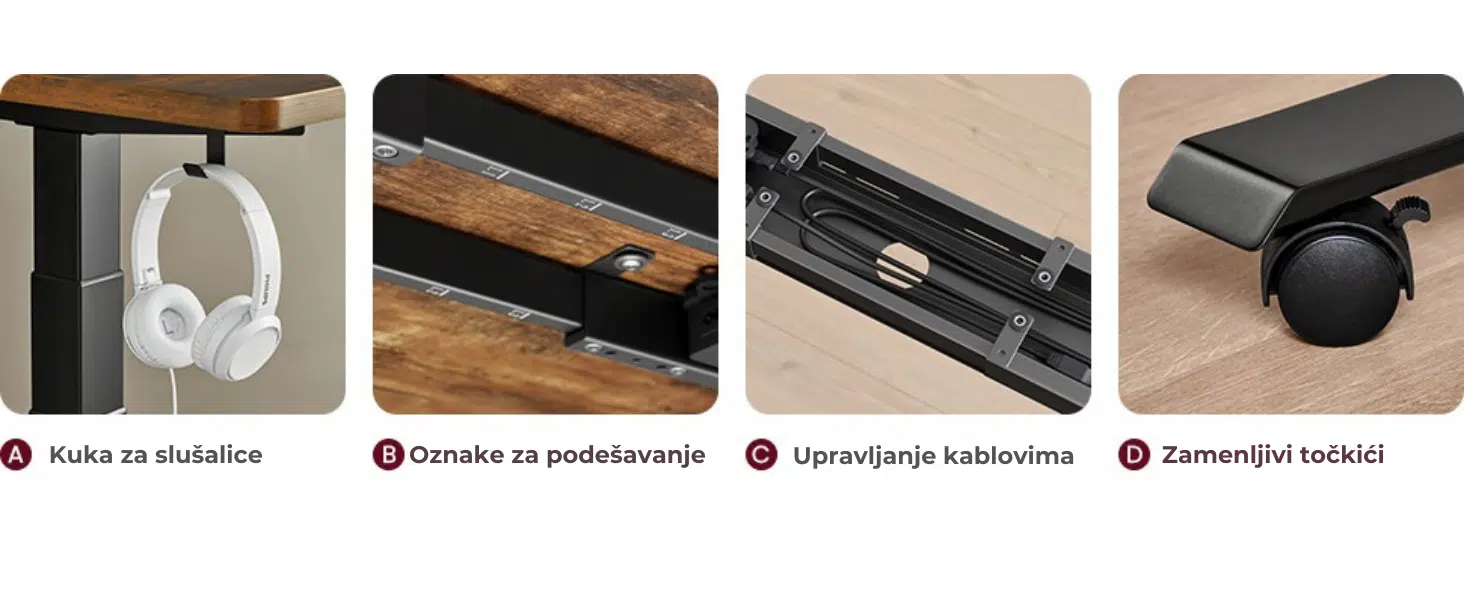 Praktični detalji dodatno unapređuju funkcionalnost. Bočne kuke omogućavaju kačenje slušalica ili torbi, dok podesive nogice pružaju stabilnost i štite pod od ogrebotina. Po potrebi, nogice se mogu zameniti točkićima, što omogućava lako pomeranje stola i veću fleksibilnost u prostoru.