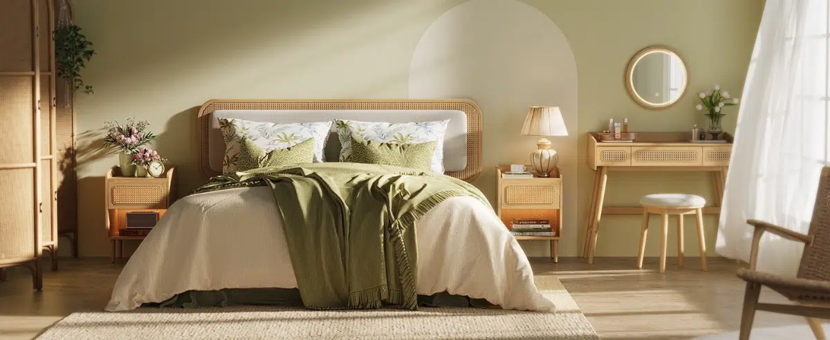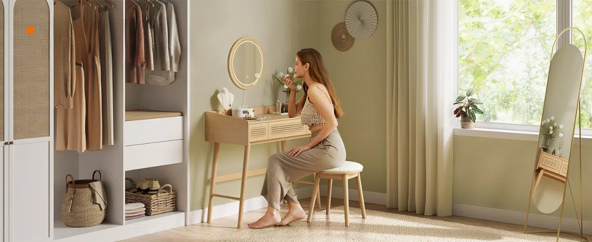 Ovaj sto za šminkanje deo je BOHOVEN kolekcije, inspirisane boemskim stilom koji kombinuje prirodne tonove, drvene noge i dekorativne pletene elemente. Dizajniran je da unese mir, toplinu i harmoniju u vaš prostor, stvarajući savršeno mesto za svakodnevne beauty rituale.