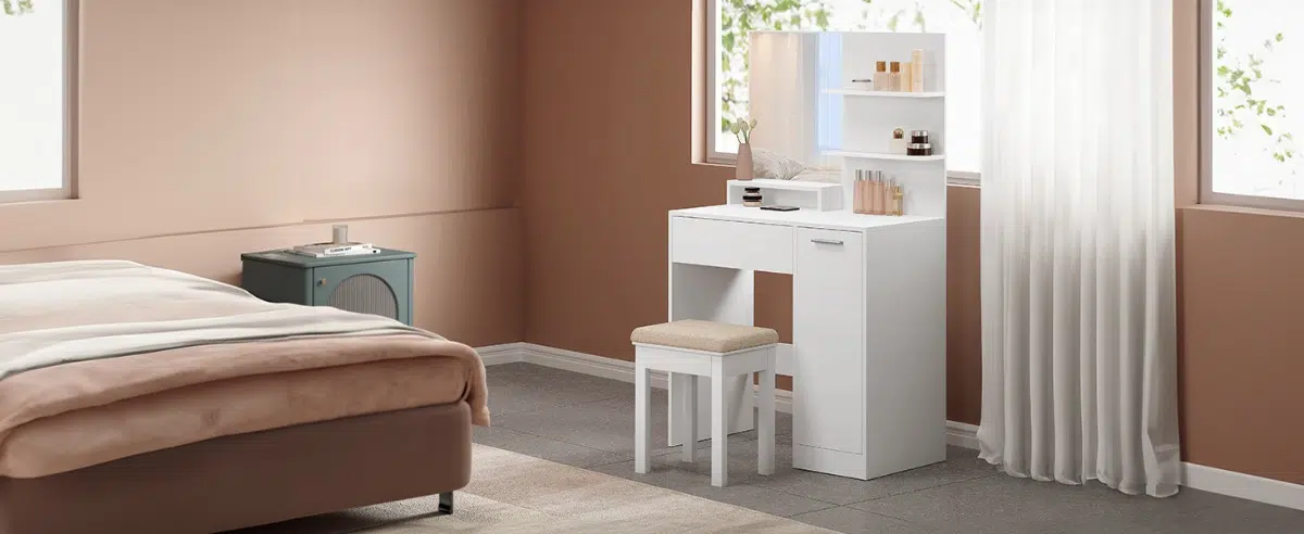 Kvalitet koji traje – izrađen od izdržljive iverice sa glatkom površinom, ovaj sto za šminkanje dizajniran je da vas prati godinama, čuvajući vašu kozmetiku bezbedno i uredno.