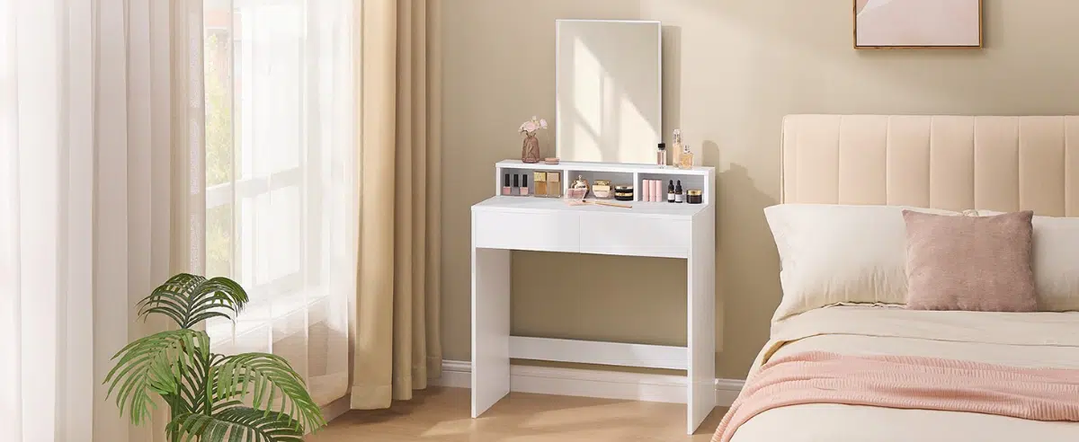 Šta dobijate – sto za šminkanje sa 2 fioke, 3 otvorene pregrade i velikim ogledalom u kojem možete svakodnevno uživati. Uz uključenu zaštitu od prevrtanja, lako ga možete pričvrstiti za zid i započeti novu, elegantnu beauty rutinu.