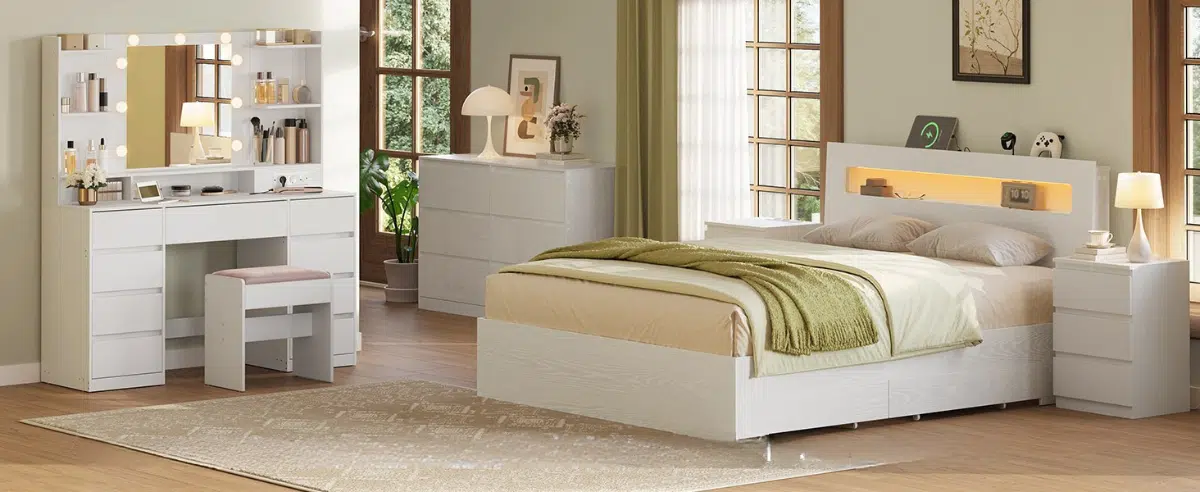Praktična stanica za punjenje – sto je opremljen sa 2 AC utičnice, 1 USB-A i 1 USB-C portom, tako da možete jednostavno puniti telefon ili koristiti beauty uređaje direktno za stolom.