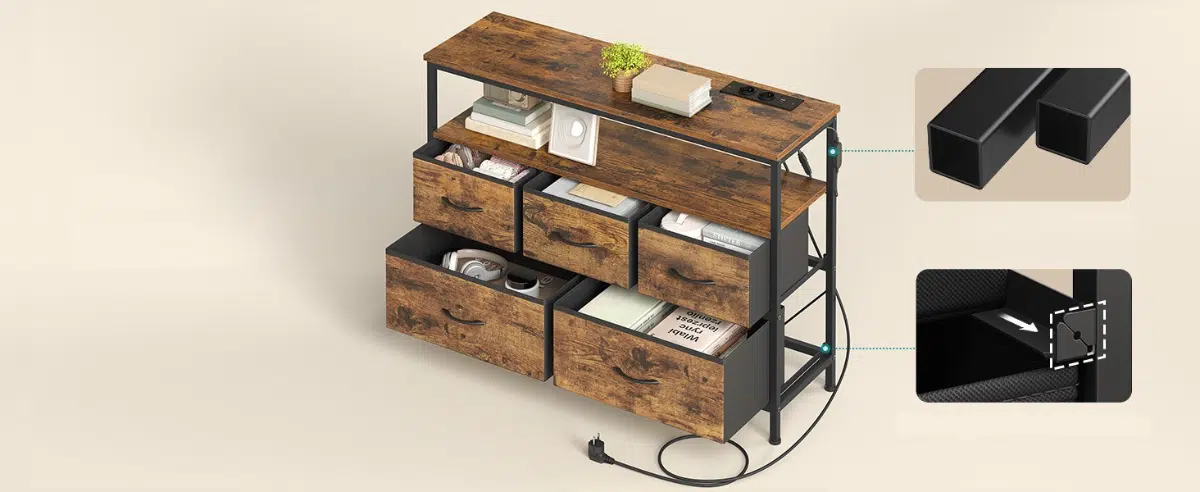 Veliki kapacitet – 3 manje i 2 veće fioke nude dovoljno prostora za odeću i sitnice, dok otvorena polica i gornja površina služe za dekoraciju, biljke ili svakodnevne predmete.