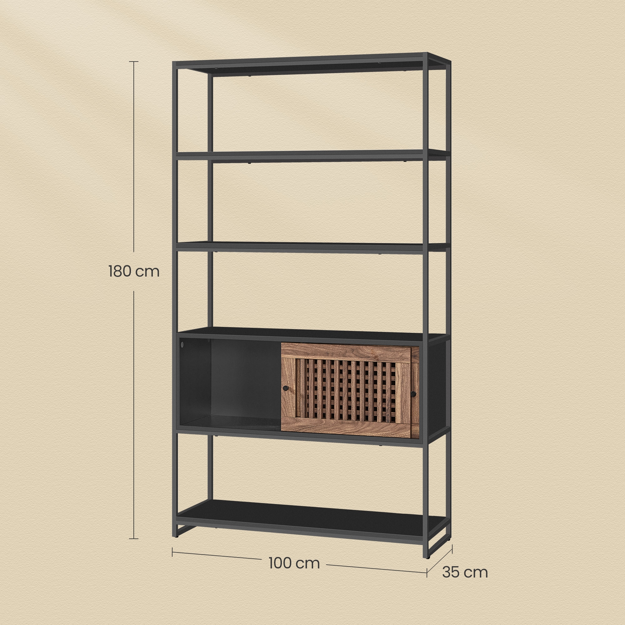 Ova polica za knjige, dimenzija 100 cm (D) × 35 cm (Š) × 181 cm (V), nudi obilje vertikalnog skladišnog prostora, pomažući vam da organizujete dom uz minimalno zauzimanje prostora. Podesivi ormarić može se postaviti na donji nivo ili na pretposlednji nivo prema vašim potrebama.