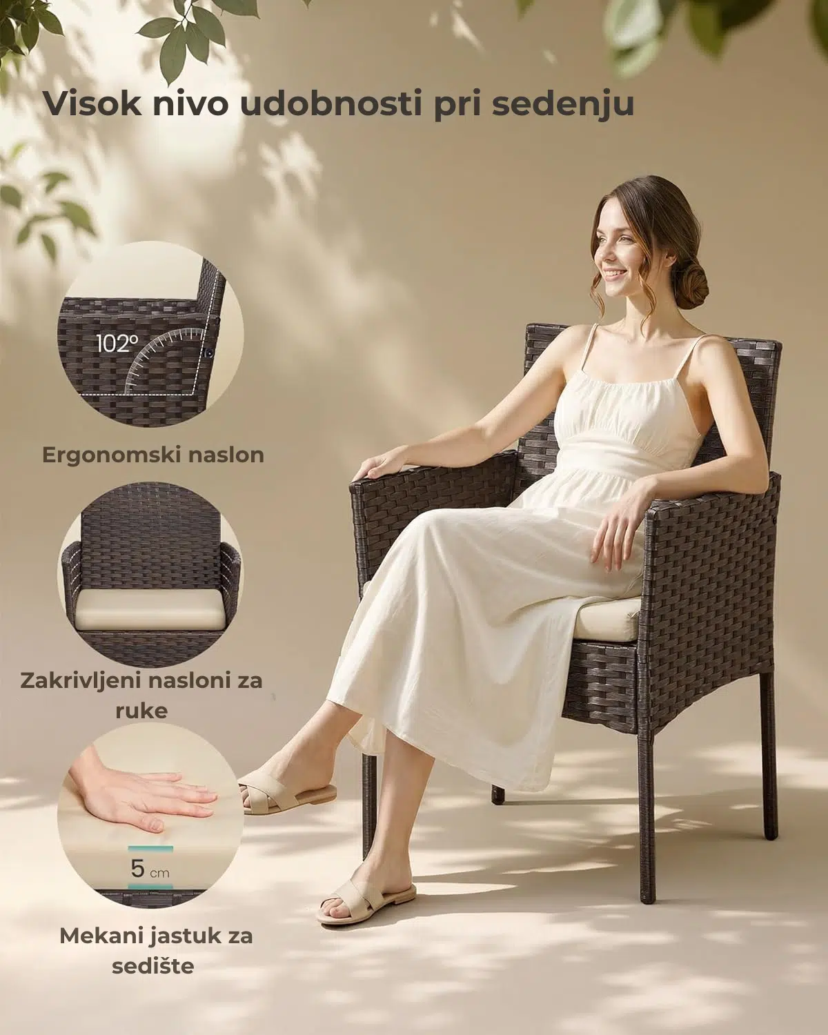 Jednostavan i elegantan dizajn ovog baštenskog seta za balkon i terasu donosi moderan izgled svakom spoljašnjem prostoru. Stabilne metalne noge naglašavaju savremeni stil, dok površina od PE ratana dodaje toplinu i prirodan izgled, stvarajući prijatnu atmosferu u vašem dvorištu tokom letnjih dana.