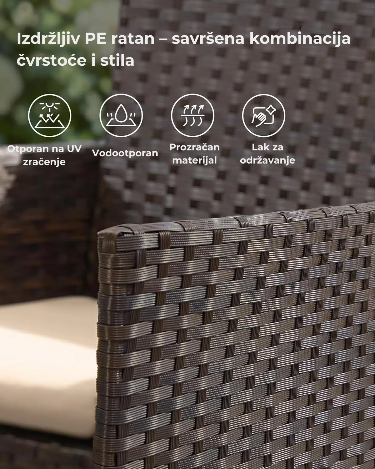 Ovaj baštenski set od ratana izrađen je od izdržljivog i vremenski otpornog PE poliratana, dok čvrst metalni okvir obezbeđuje stabilnost i dug vek trajanja. Materijali su dizajnirani da izdrže različite vremenske uslove, pa set može bez problema podneti kišu, sunce i hladnije periode.