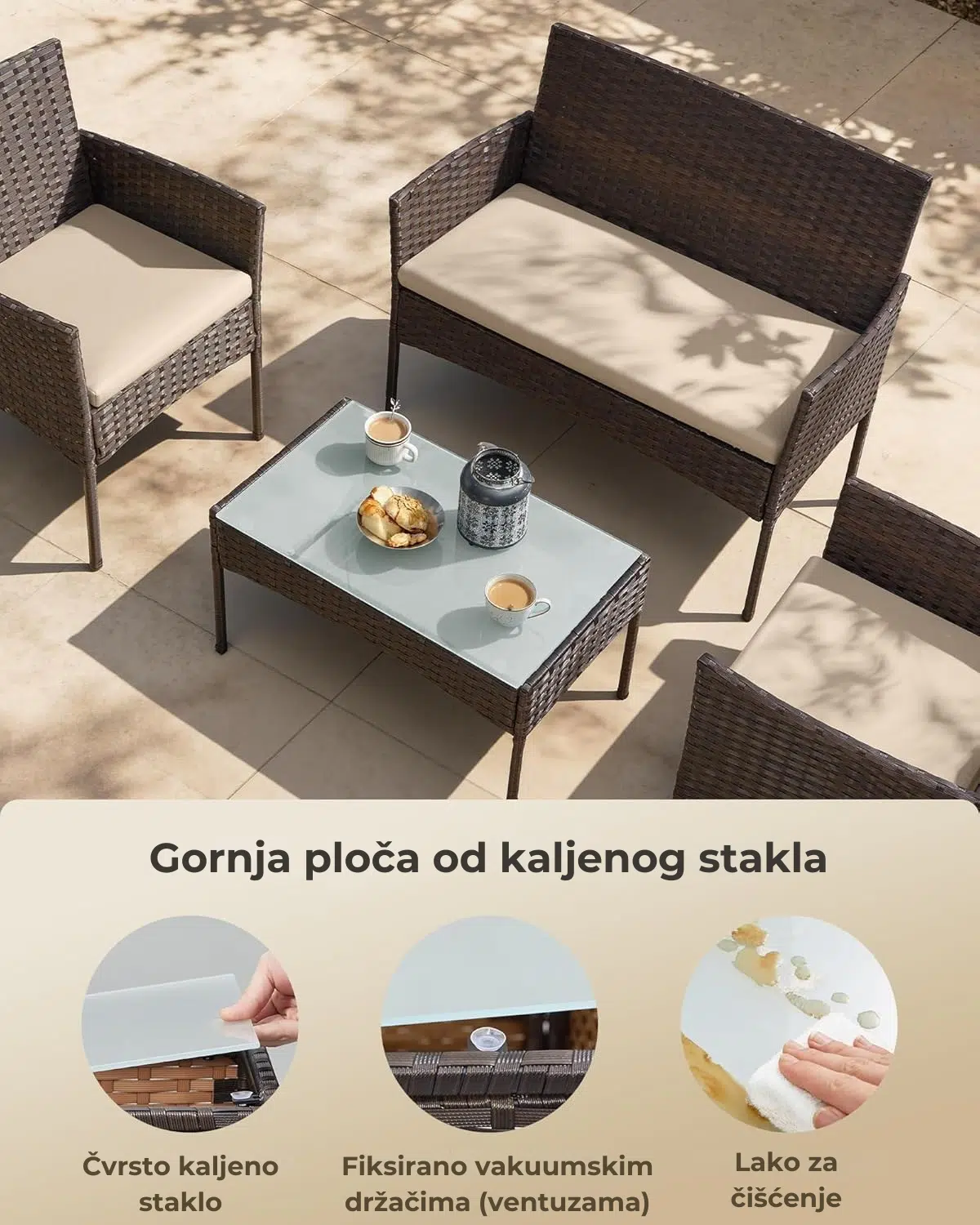 Materijali nameštaja: čelik sa praškastim premazom, polietilen (PE ratan), kaljeno staklo