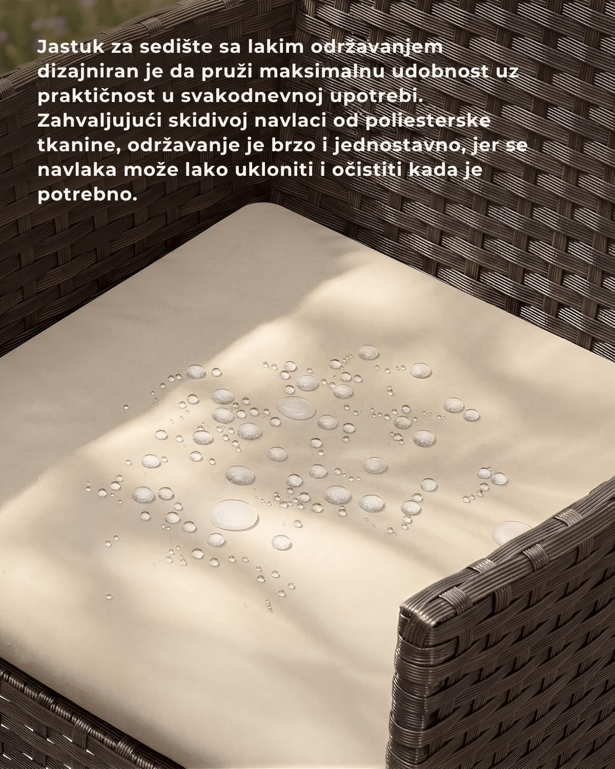 Uživajte u opuštanju na otvorenom zahvaljujući mekim jastucima za sedište debljine 5 cm koji pružaju dodatni komfor. Navlake jastuka se mogu skinuti i lako očistiti, dok je sto sa kaljenim staklom jednostavan za održavanje i čišćenje.