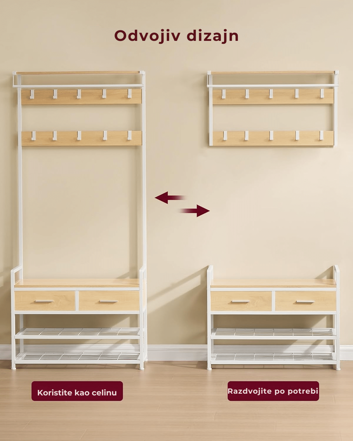 Prilagodljiv dizajn – koristite ga kao celinu za maksimalnu organizaciju ili ga razdvojte u zidnu vešalicu sa policom i klupu za cipele, u zavisnosti od vaših potreba.