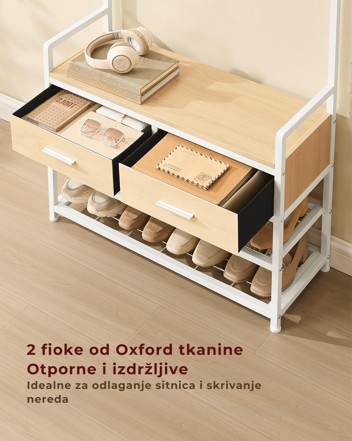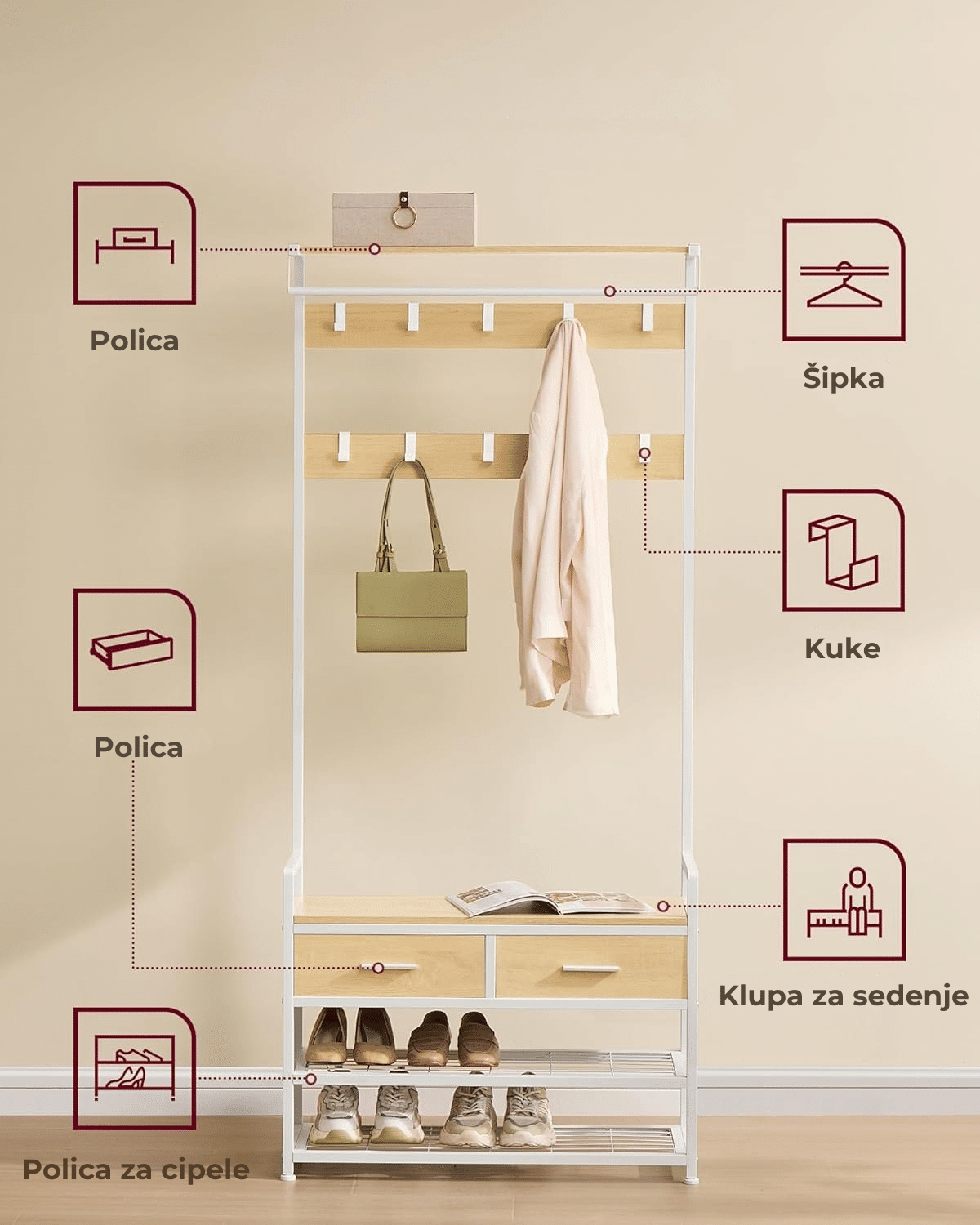 Multifunkcionalni 6-u-1 dizajn – ovaj čiviluk objedinjuje 10 kuka za kačenje, 2 fioke, šipku za odeću, klupu za sedenje, policu za cipele i dodatne police, pružajući maksimalnu funkcionalnost i organizaciju u hodniku.