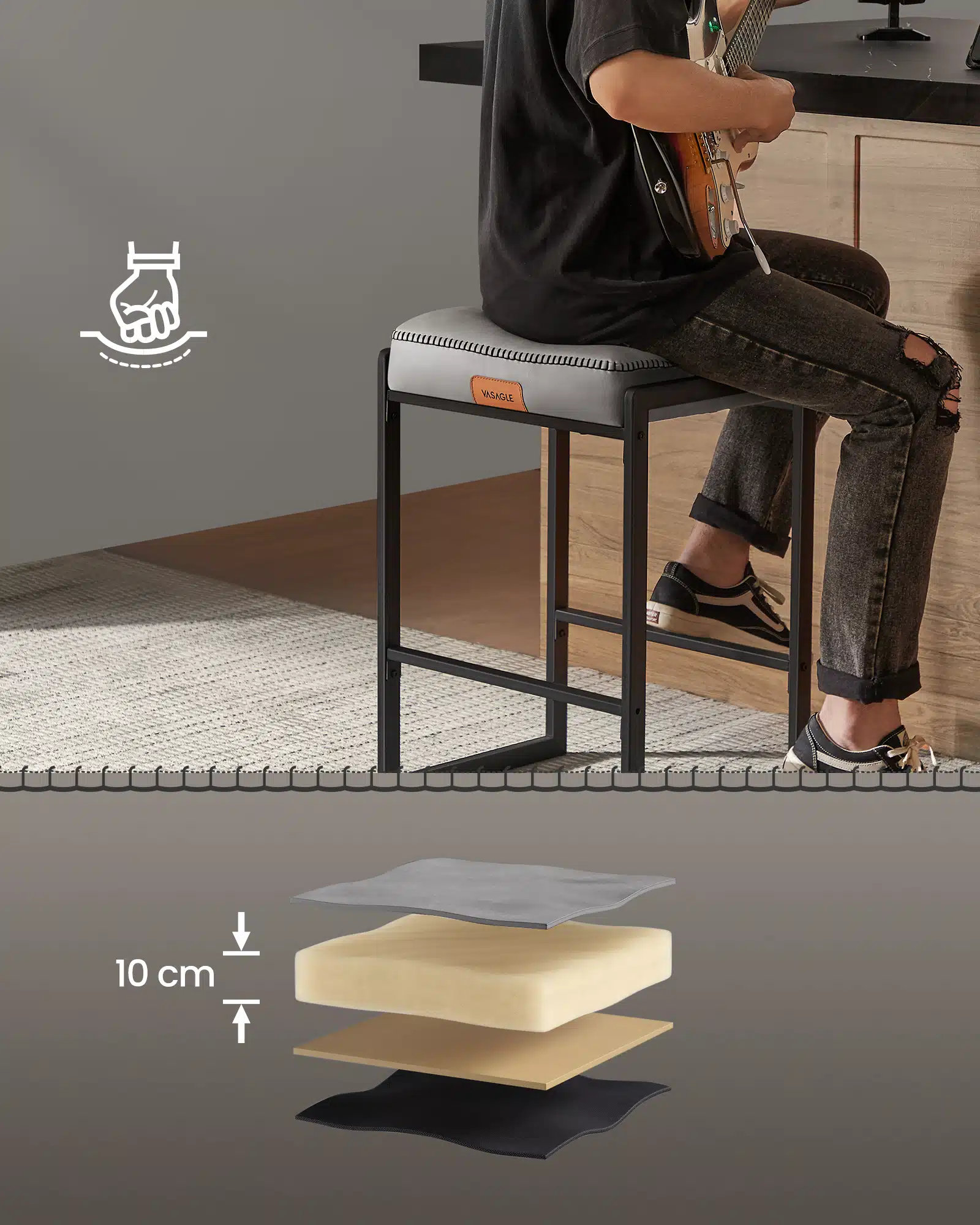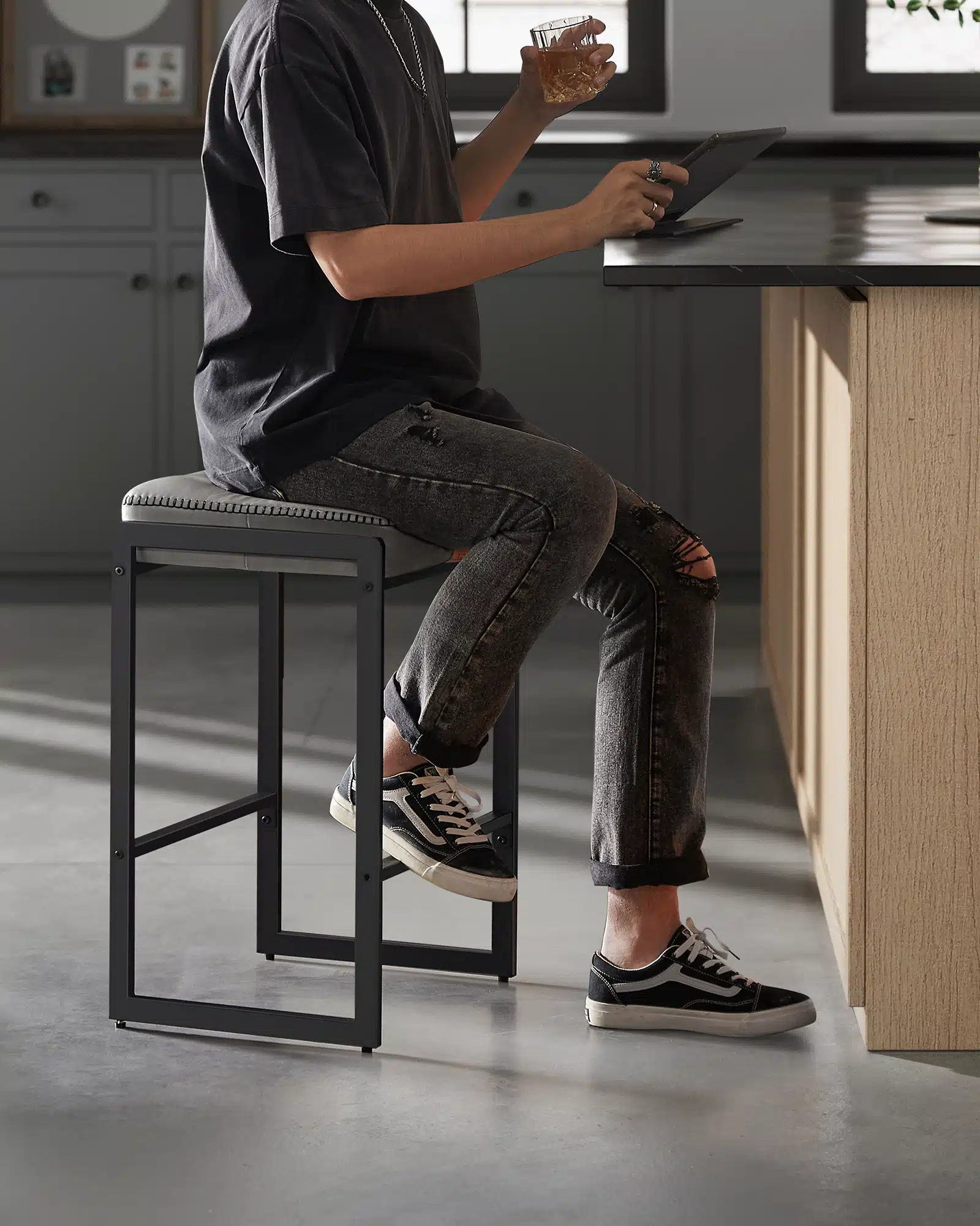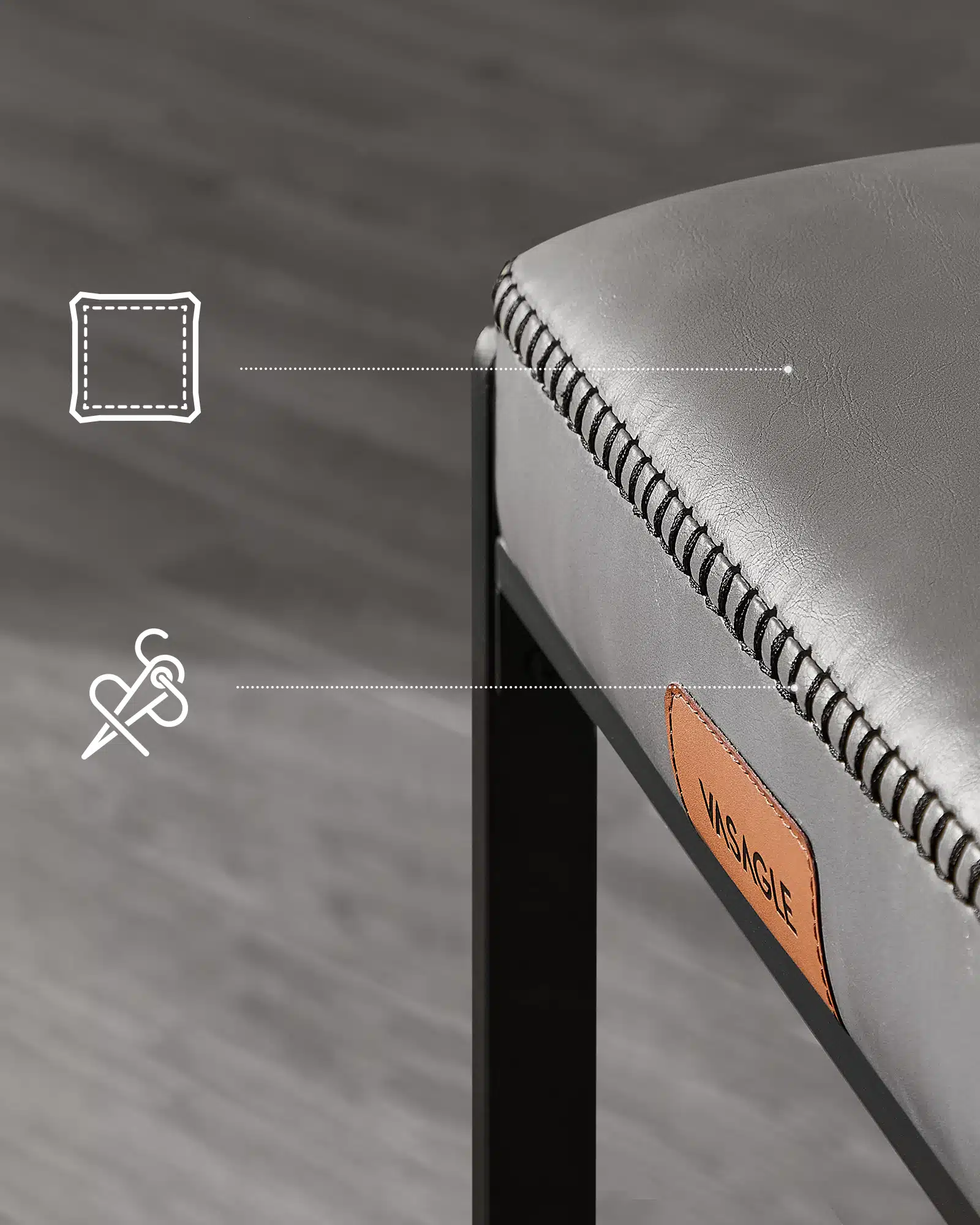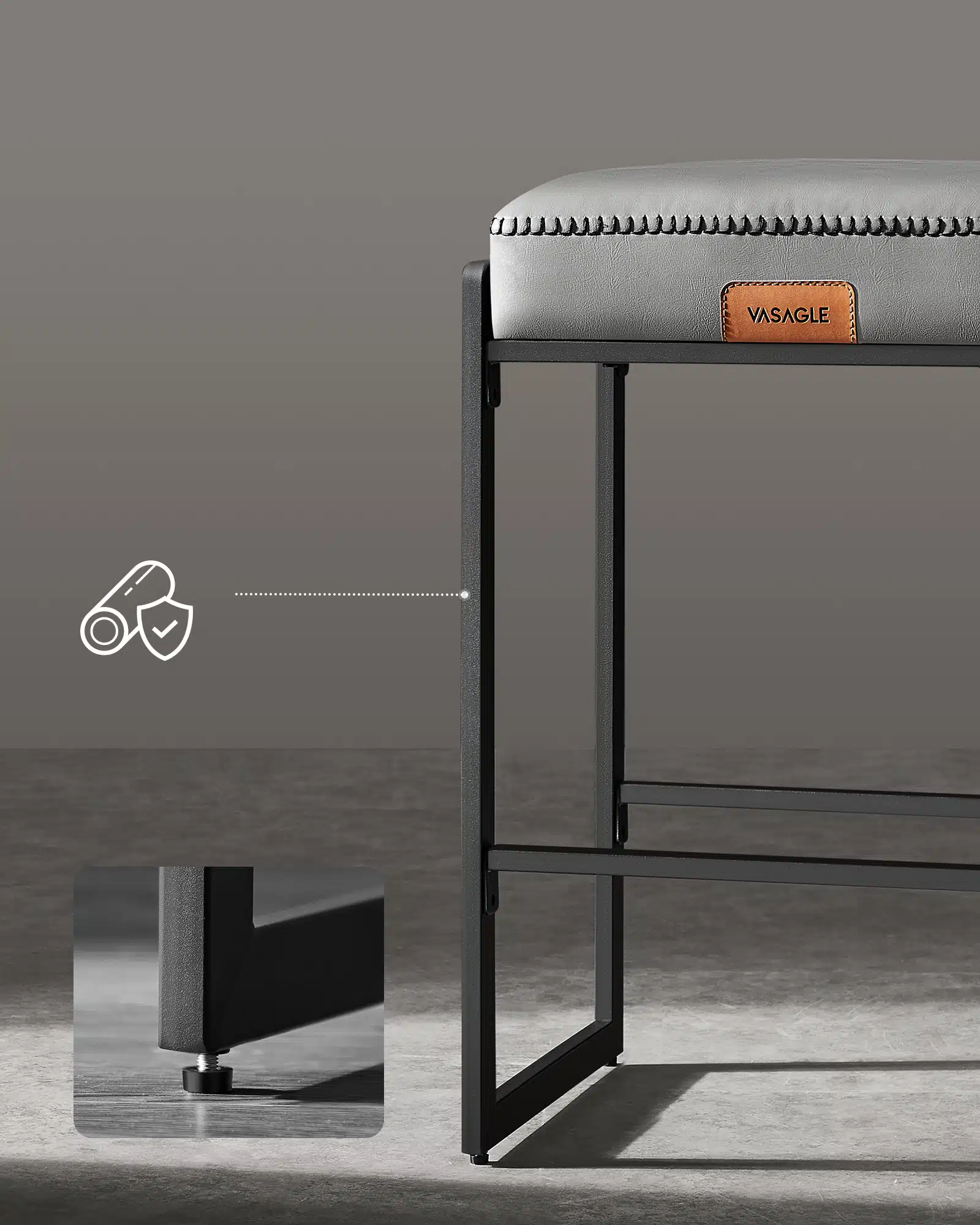 Presvlaka od vodootporne veštačke kože lako se čisti, dok mat crne čelične noge odolevaju svakodnevnim ogrebotinama i zadržavaju sofisticirani izgled.