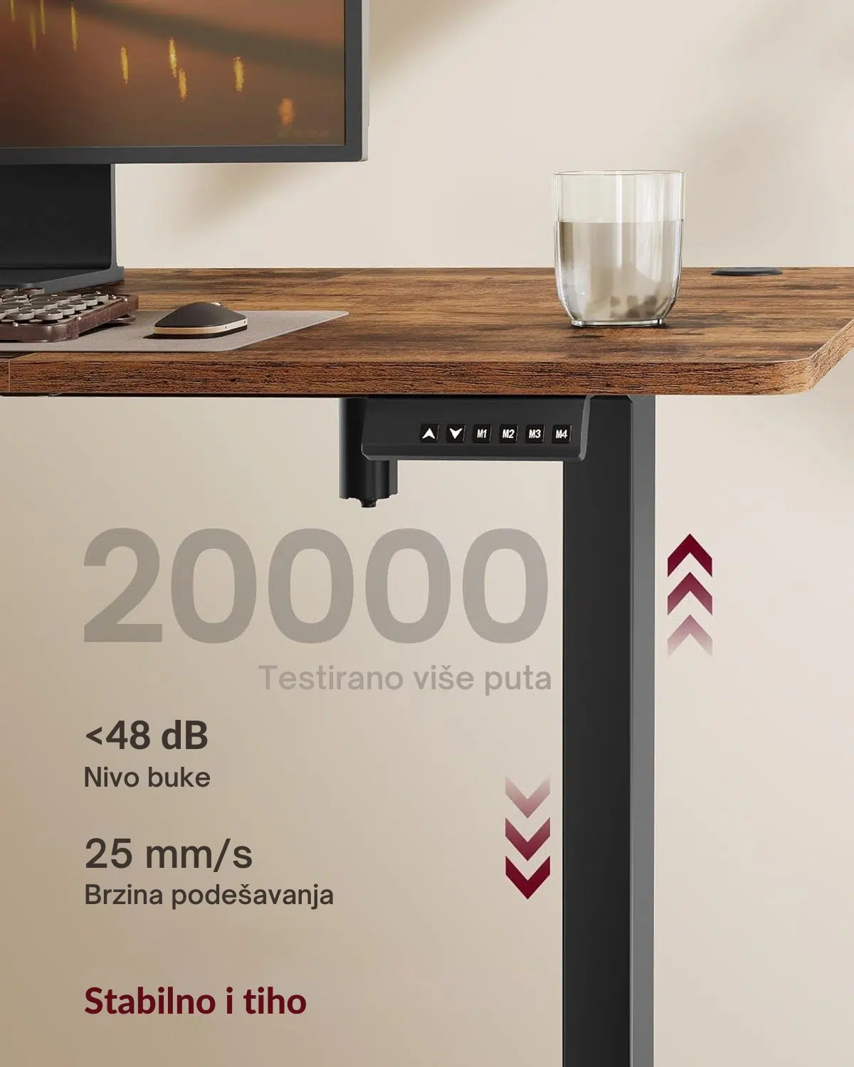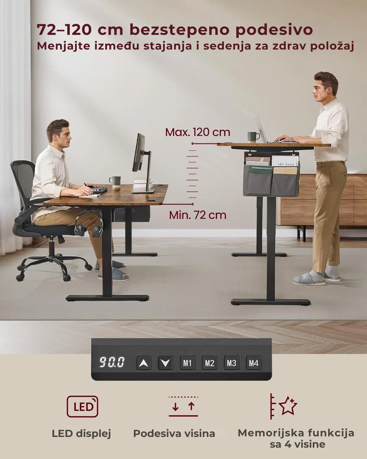 Ovaj sto je podesiv po visini od 72 do 120 cm, što vam omogućava lako prebacivanje između sedenja i stajanja. Uz memorijsku funkciju sa 4 podešene visine, rad postaje udobniji i zdraviji.