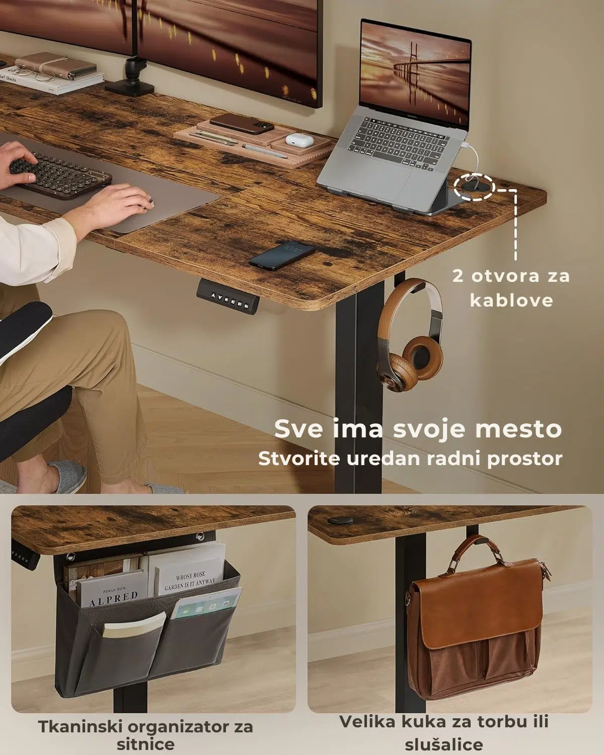Sto ima 2 otvora za kablove za urednu organizaciju. Uključuje i praktičan tkaninski organizator za sitnice, kao i veliku kuku za torbu ili slušalice.