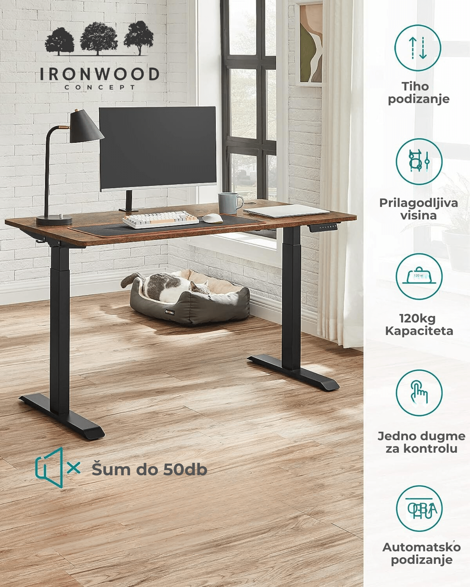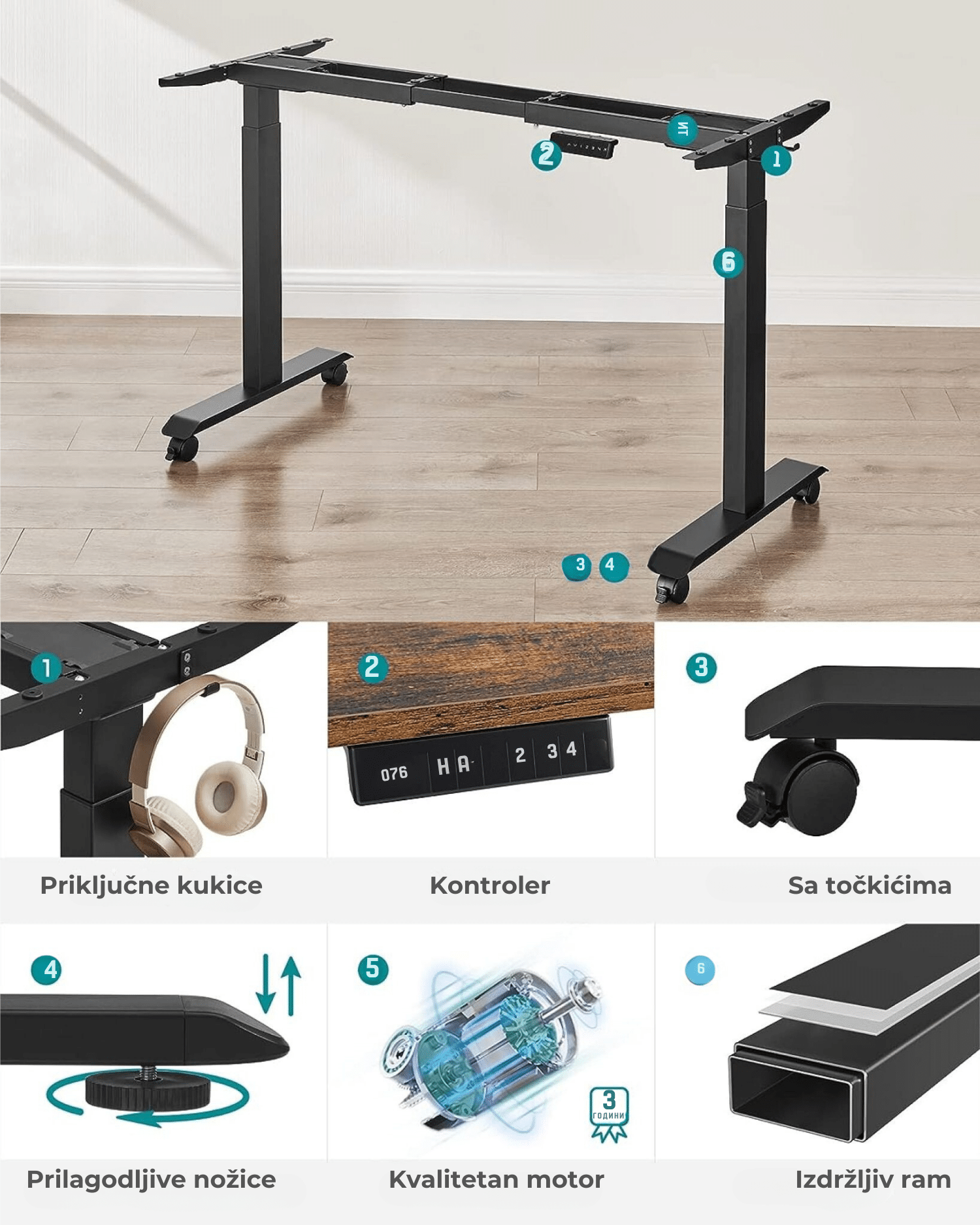 Dvostruke potporne šipke, čelična konstrukcija, dvostruki motor i podesive nožice, koje se mogu zameniti sa 4 točkića, pružaju ovom ramu za radni sto visoku stabilnost i nosivost do 120 kg.