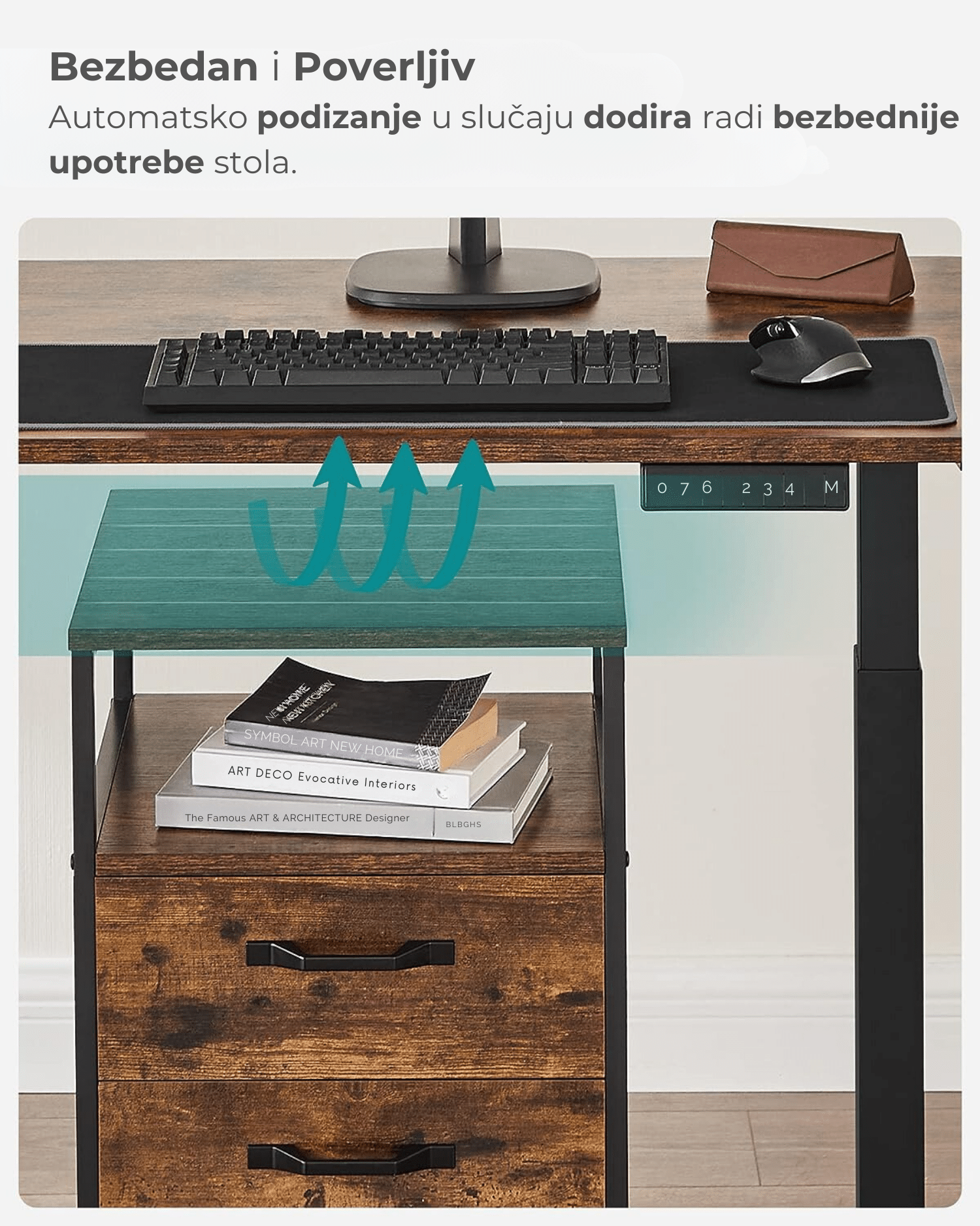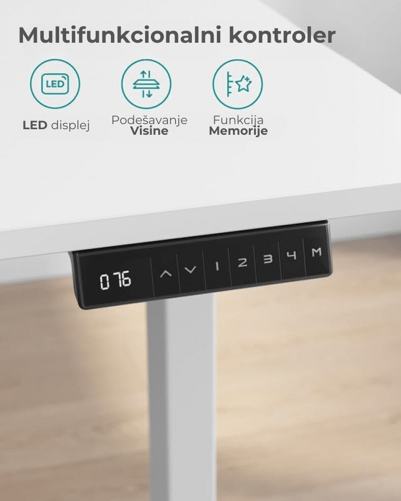 Sa dugmićima možete zapamtiti 4 visine; iz sigurnosnih razloga, podešavanje visine se zaustavlja i blago povlači pokretni sto kada naiđe na prepreku tokom pomeranja.