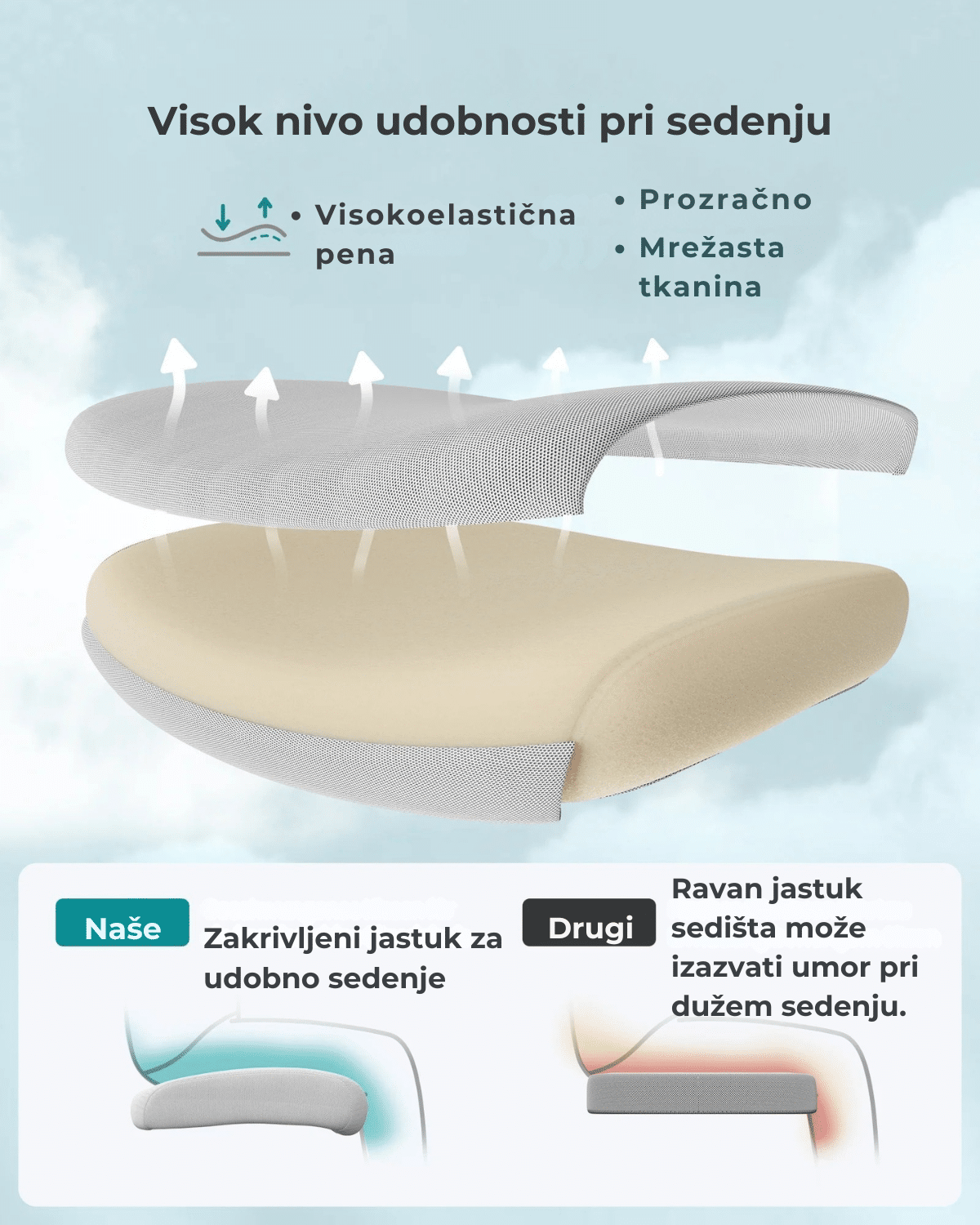 Zakrivljeno sedište sa 7 cm debelom penom pruža vrhunsku udobnost i smanjuje pritisak na kukove i noge. Naslon je obložen elastičnom najlonskom mrežom, koja je prozračna i izdržljiva.