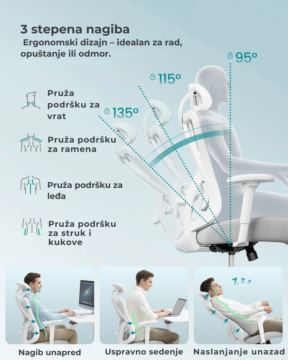 Naslon stolice može se podesiti na 90°, 115° ili 130°. Bilo da želite da radite, opustite se ili napravite kratku pauzu, lako ćete pronaći idealan položaj.