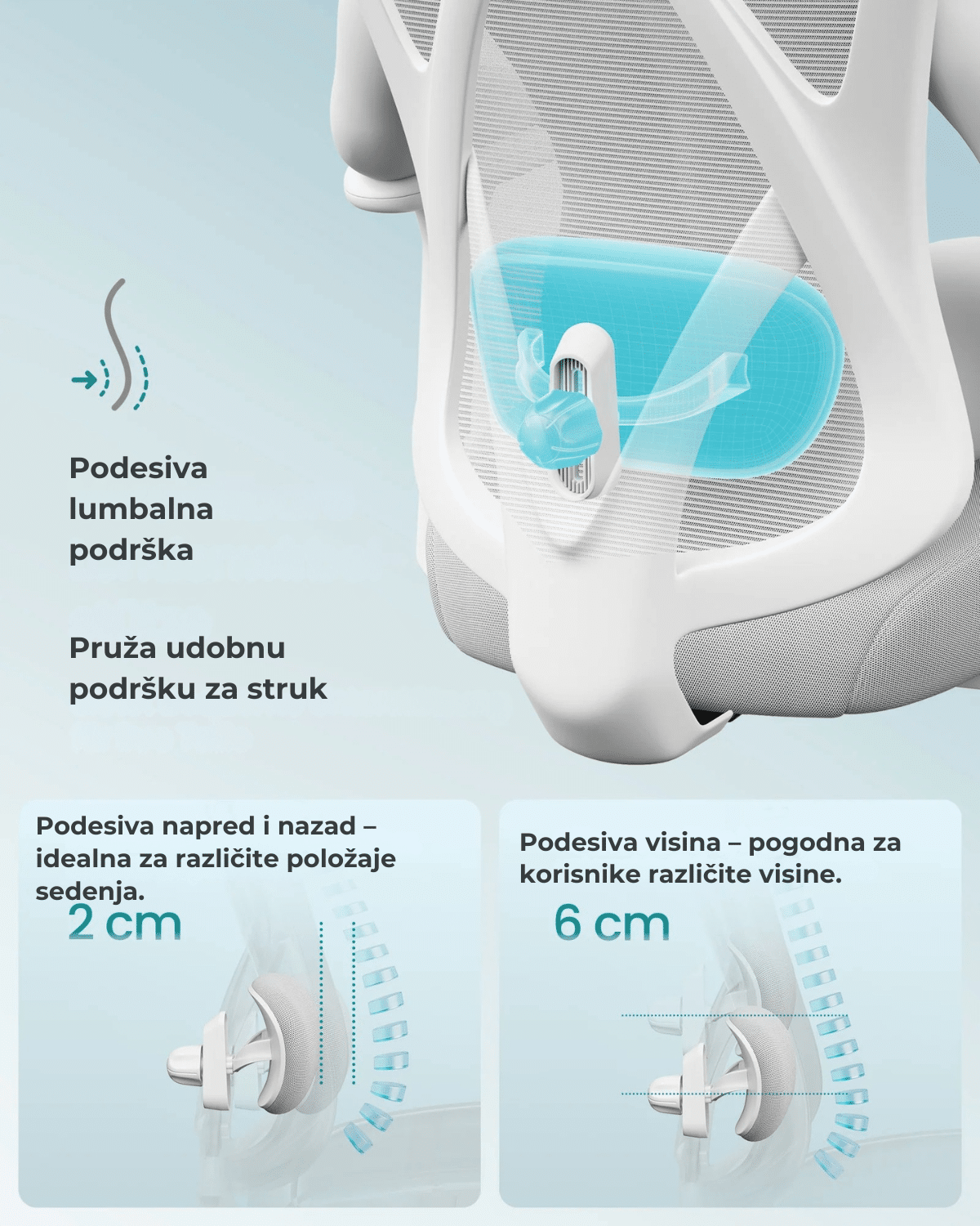 Tapacirani lumbalni jastuk pruža meku i stabilnu podršku za donji deo leđa. Može se podesiti 6 cm po visini i 2 cm napred ili nazad, što ga čini pogodnim za različite visine korisnika i položaje sedenja.