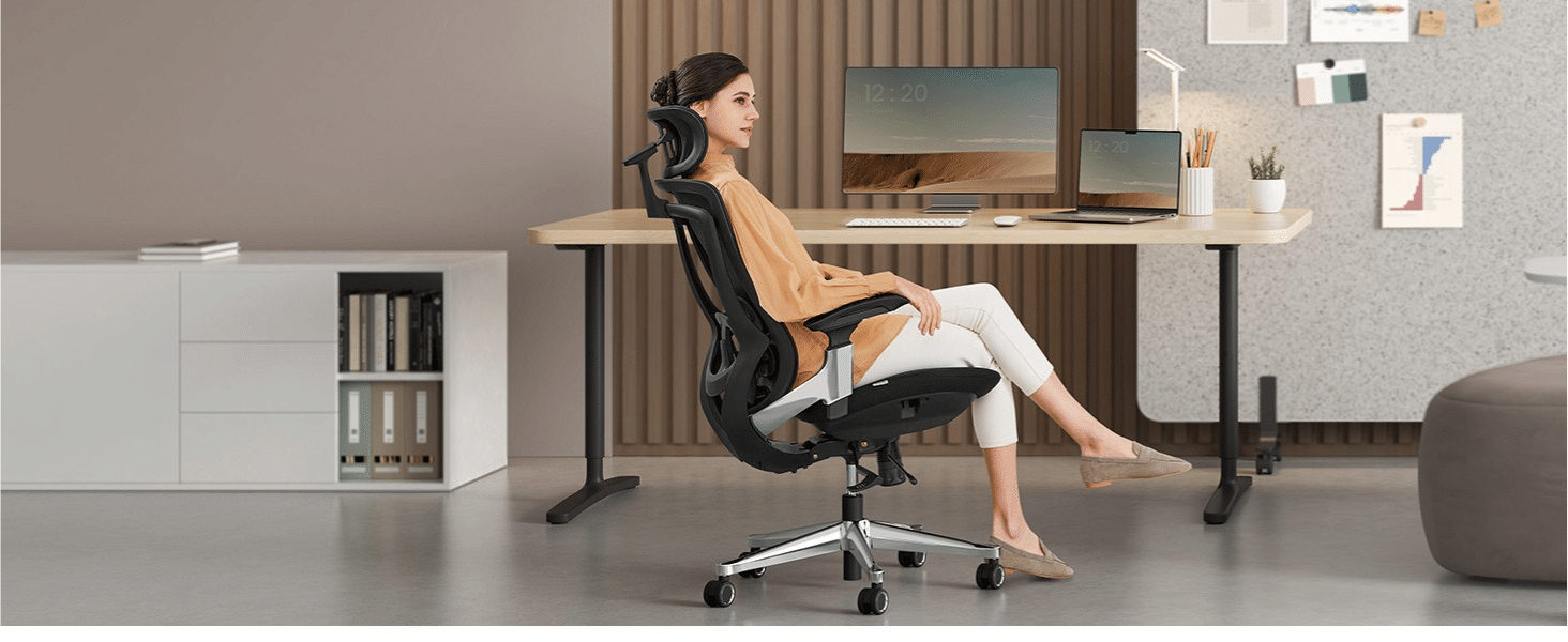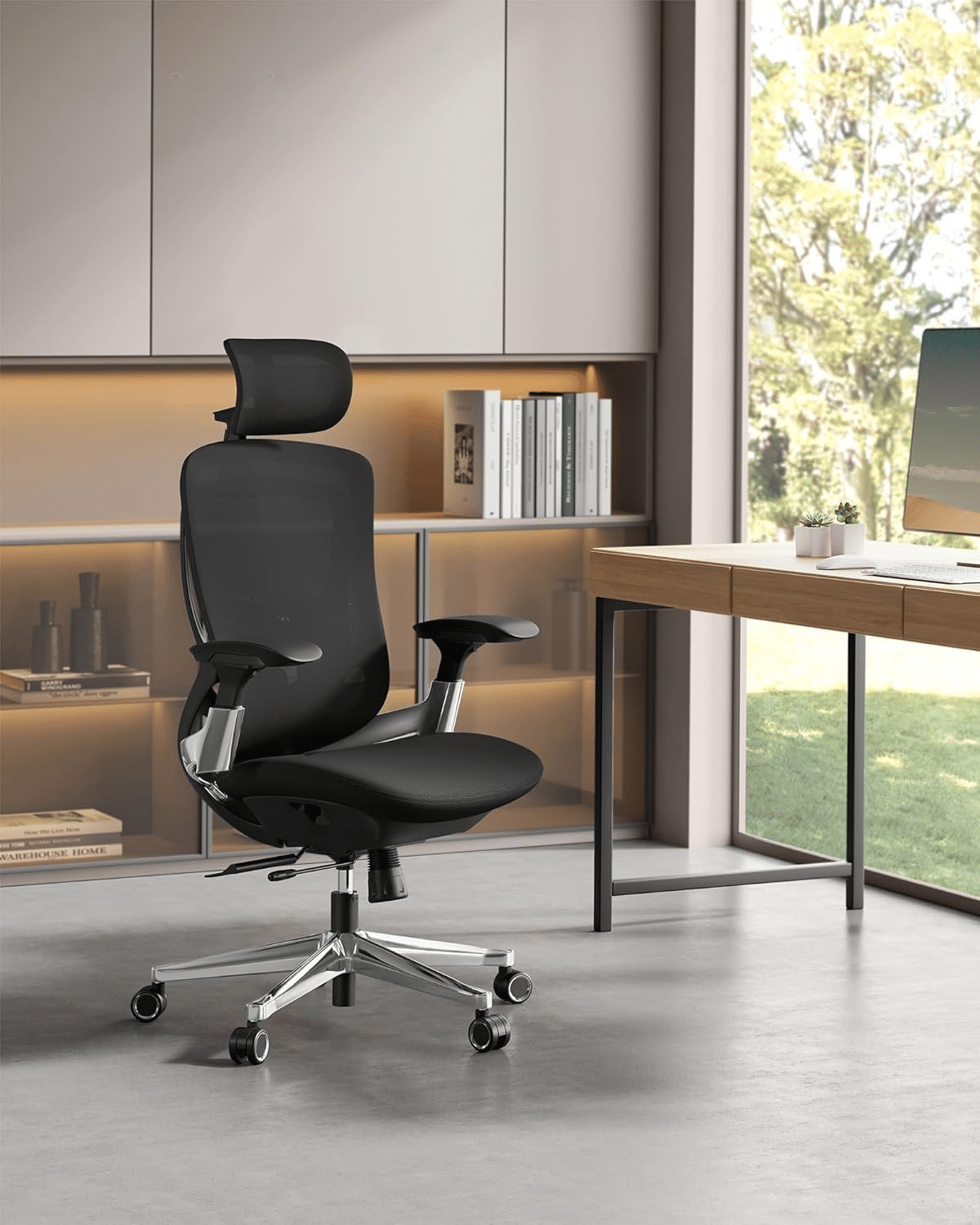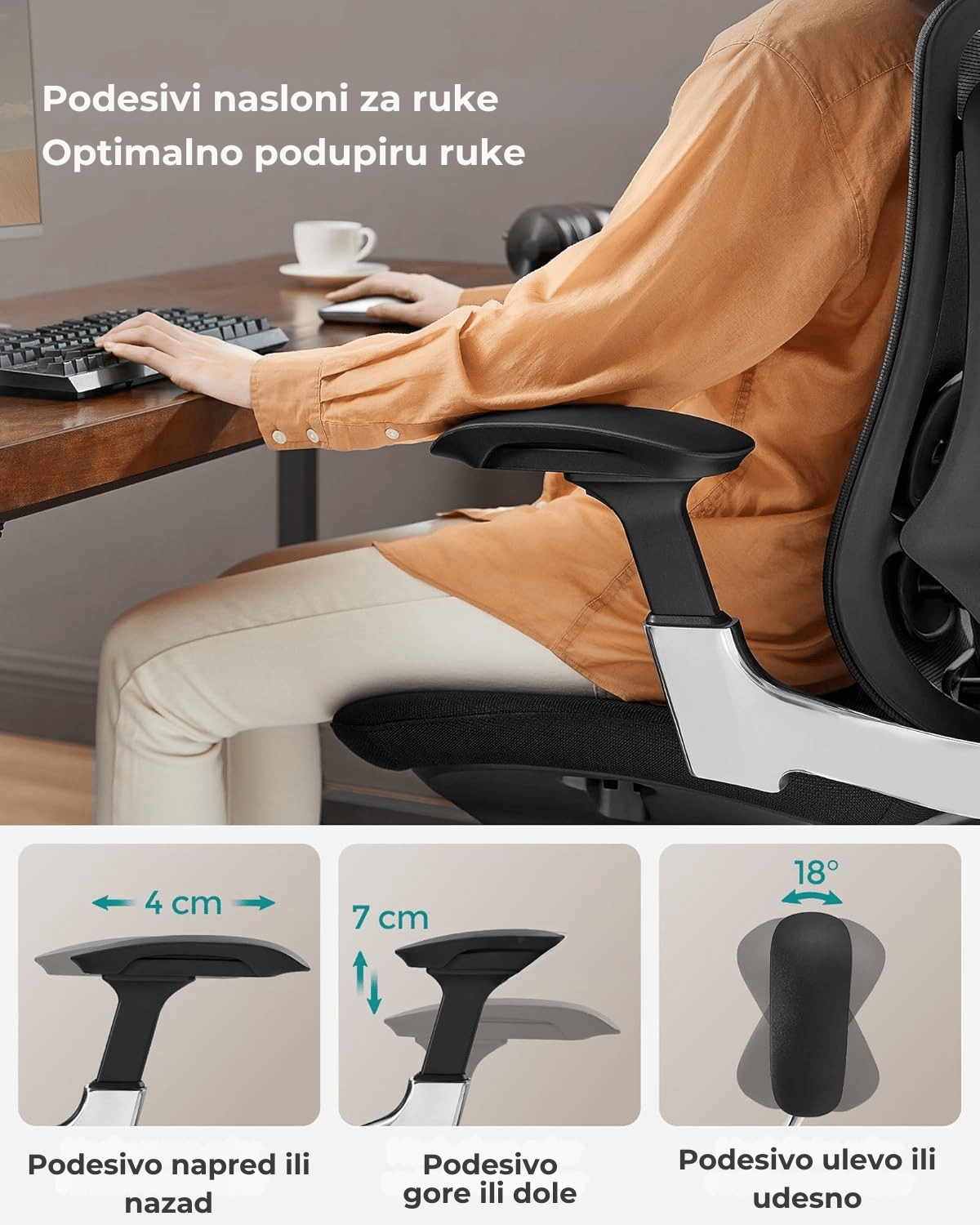 Ova mrežasta stolica pruža optimalnu podršku za glavu, leđa, kukove i ruke. Naslon za glavu, lumbalna podrška, sedište i nasloni za ruke su podesivi prema vašim potrebama i pomažu u smanjenju zamora tokom dugotrajnog sedenja.