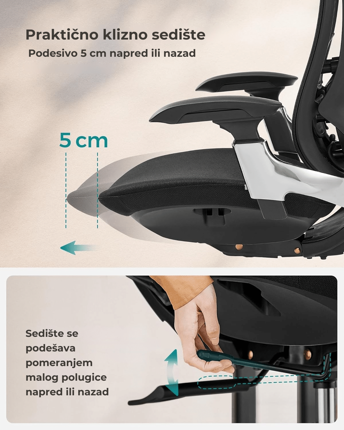 Sedište se može pomerati napred i nazad do 5 cm, što ga čini pogodnim za osobe različite visine. Punjenje od pene visoke gustine i prozračna mrežasta tkanina obezbeđuju visok nivo udobnosti.
