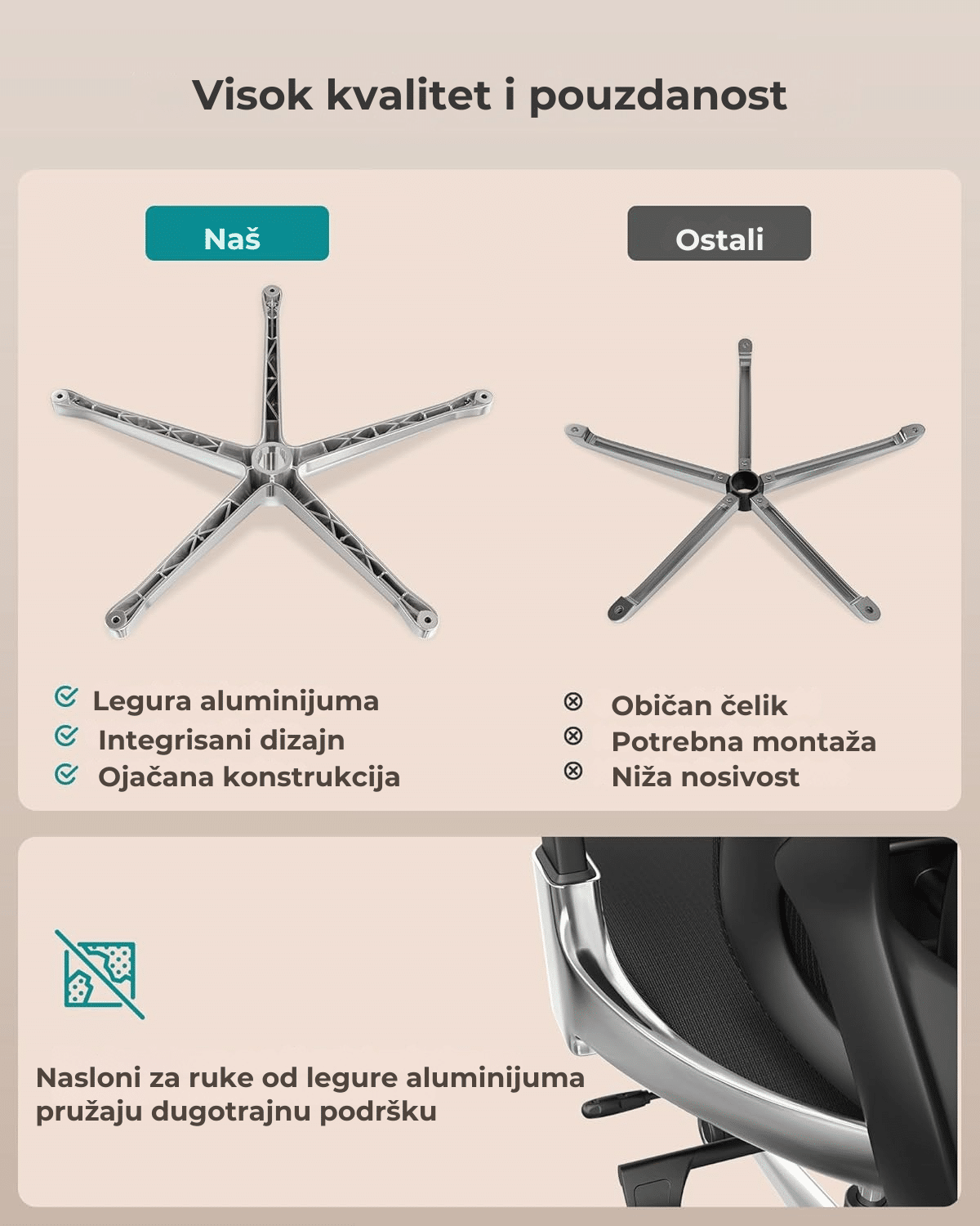 Stolica je opremljena BIFMA sertifikovanim točkićima koji omogućavaju tiho i glatko kretanje. Delimično izrađena od legure aluminijuma, baza i nasloni za ruke su izuzetno čvrsti i dugotrajni, uz maksimalnu nosivost do 150 kg.
