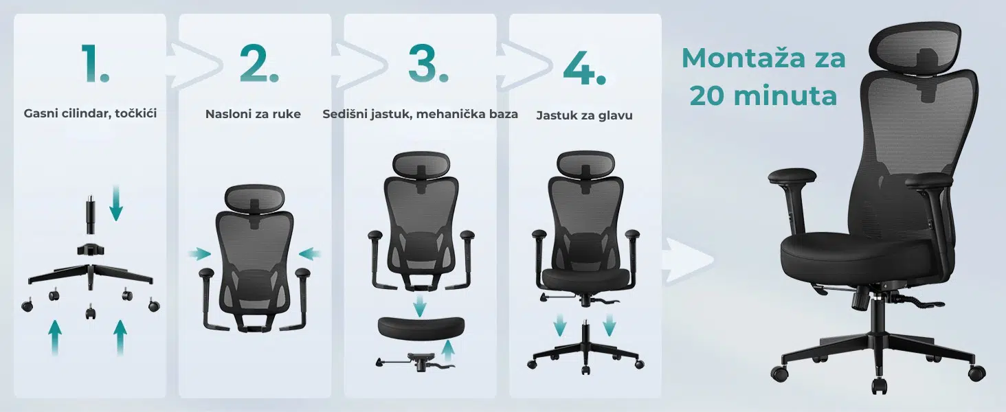 Zahvaljujući ilustrovanim uputstvima i numerisanim delovima, jedna osoba može sastaviti ovu kancelarijsku stolicu za 15–30 minuta.