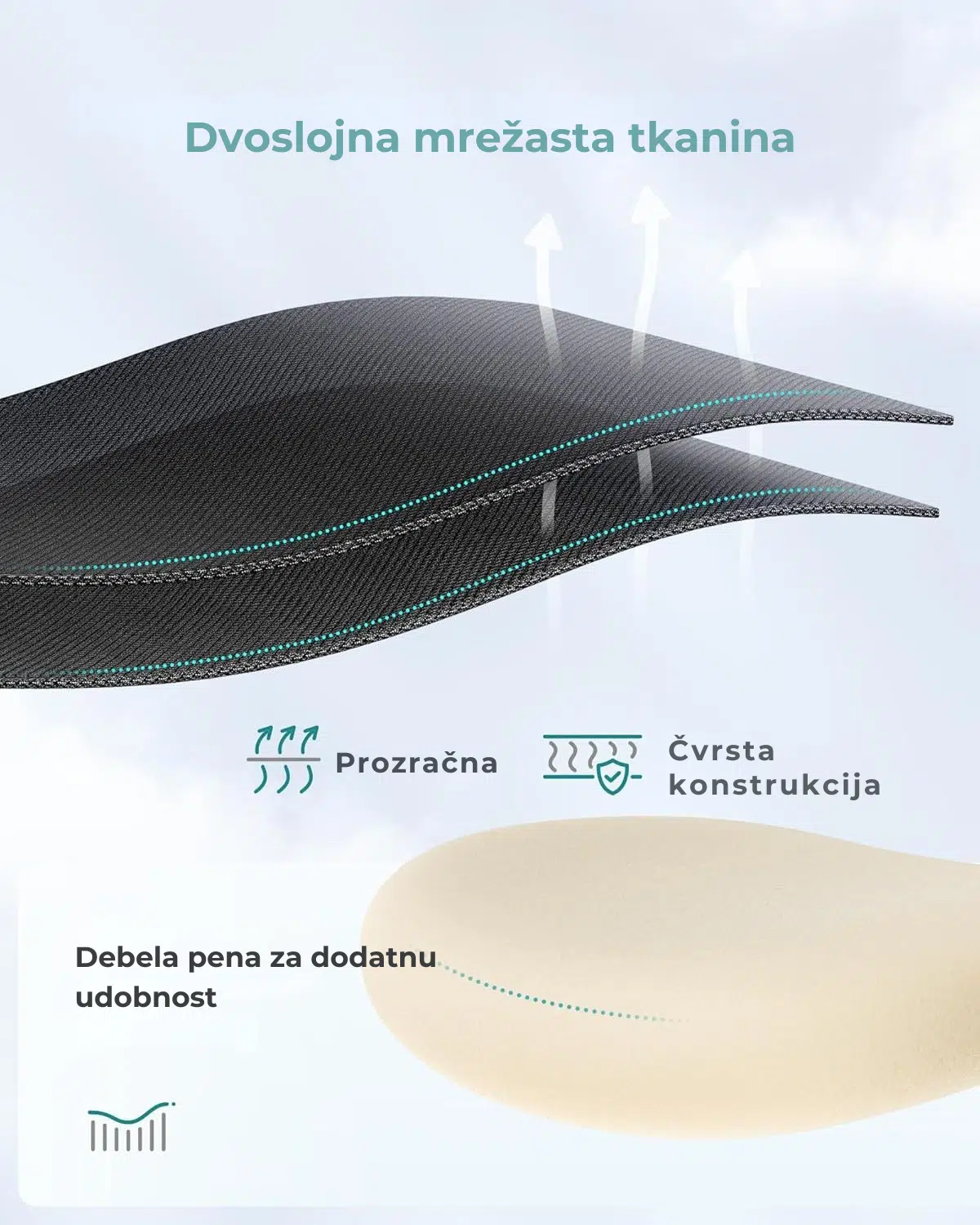 Dvoslojna mrežasta tkanina je izdržljiva i prozračna, dok mekano podstavljeno sedište smanjuje pritisak na kukove i pruža udobnost tokom dugog sedenja.