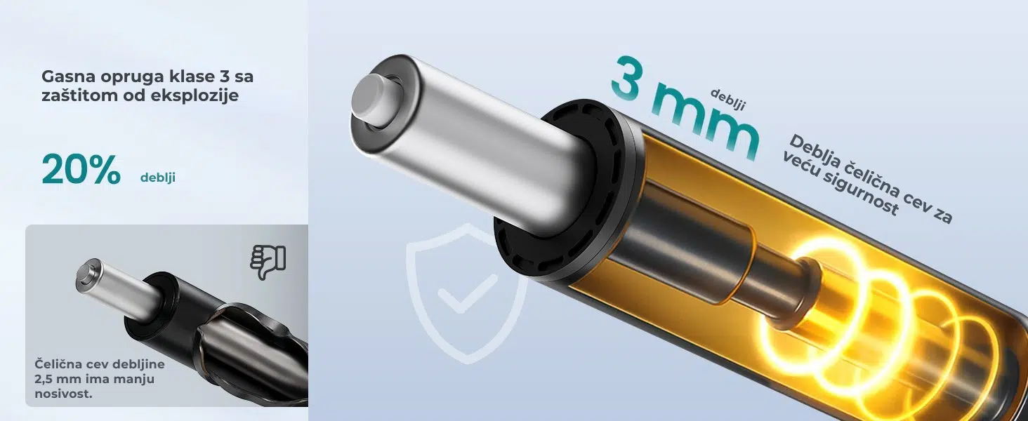 Kvalitetna gasna opruga i čvrsta mehanička baza obezbeđuju visoku sigurnost. Baza je testirana na statičko opterećenje od oko 590 kg.