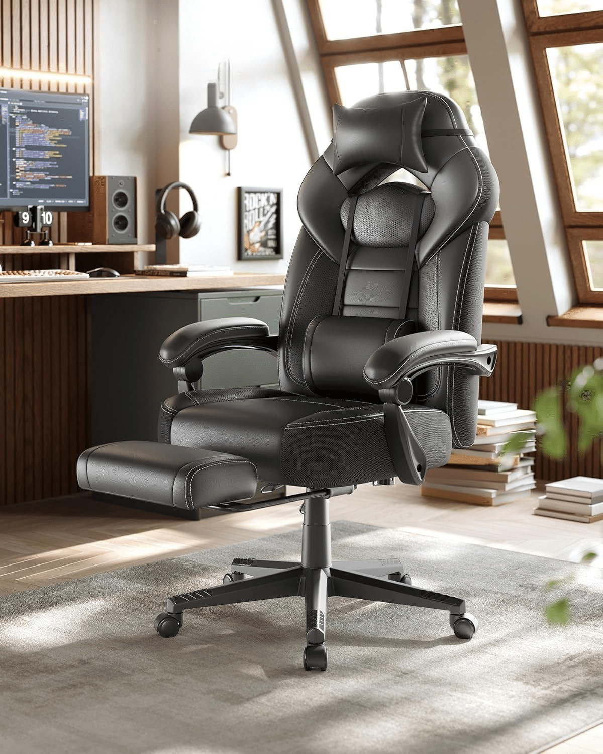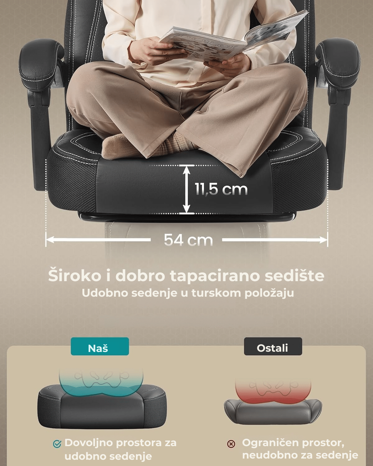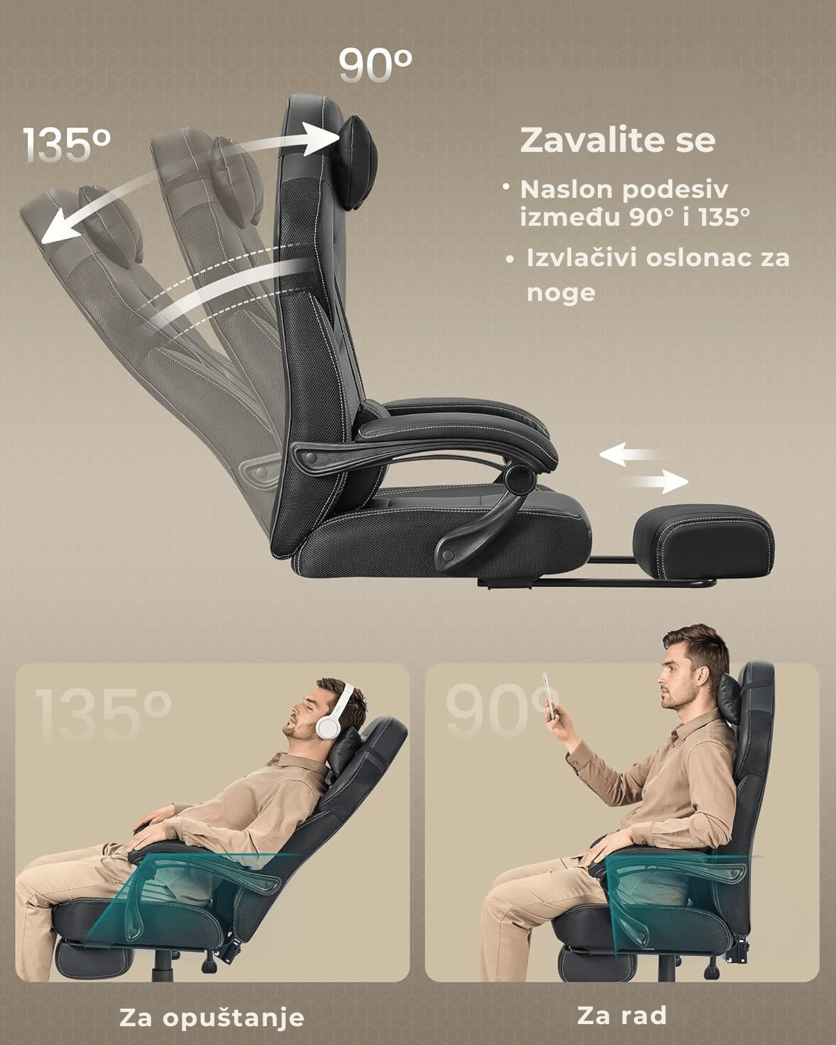 Kada želiš pauzu – samo izvuci oslonac za noge, podesi naslon između 90° i 135° i potpuno se opusti. Debelo tapacirano sedište dodatno povećava osećaj udobnosti, čak i nakon više sati korišćenja.
