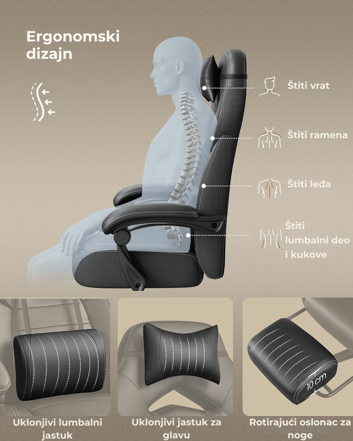 S-oblikovan naslon savršeno prati liniju tela i pruža stabilnu podršku za leđa, vrat i ramena. Uz podesivi jastuk za glavu i lumbalni deo, sedenje postaje prirodnije i bez opterećenja.
