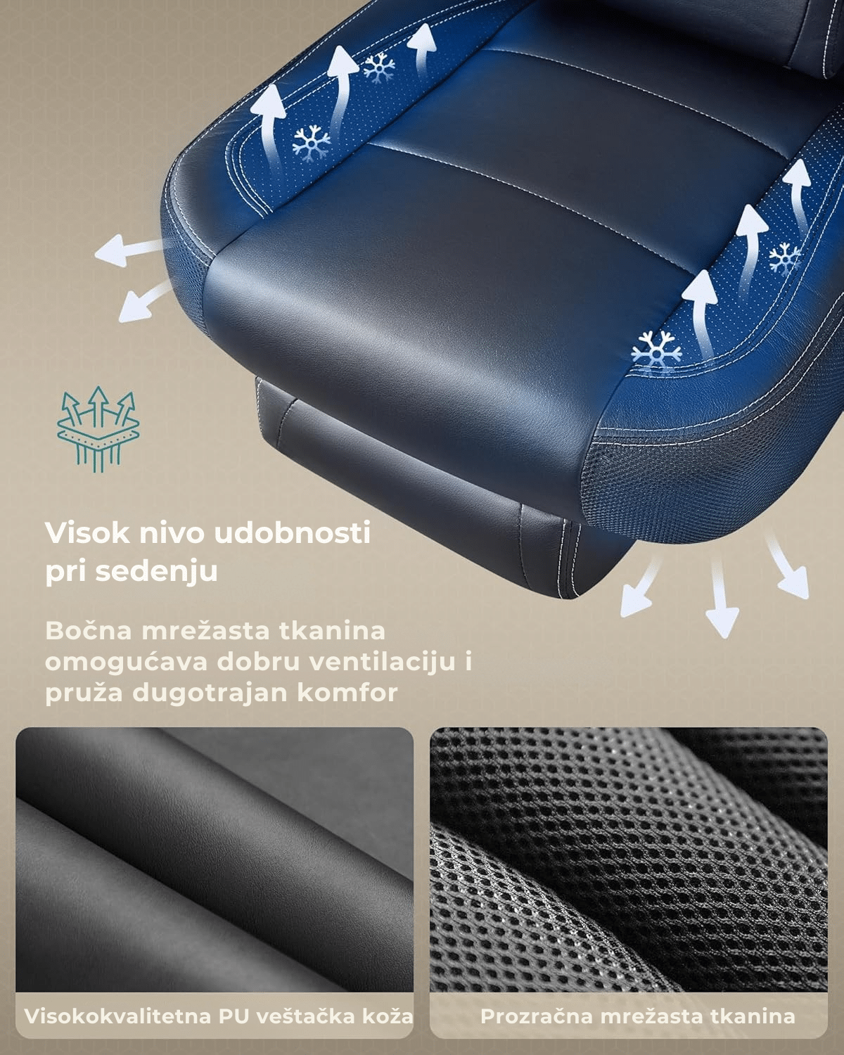 Kombinacija veštačke kože i mrežaste tkanine omogućava prijatan osećaj i bolju ventilaciju, dok ojačani nasloni za ruke i stabilna konstrukcija garantuju sigurnost do 150 kg.