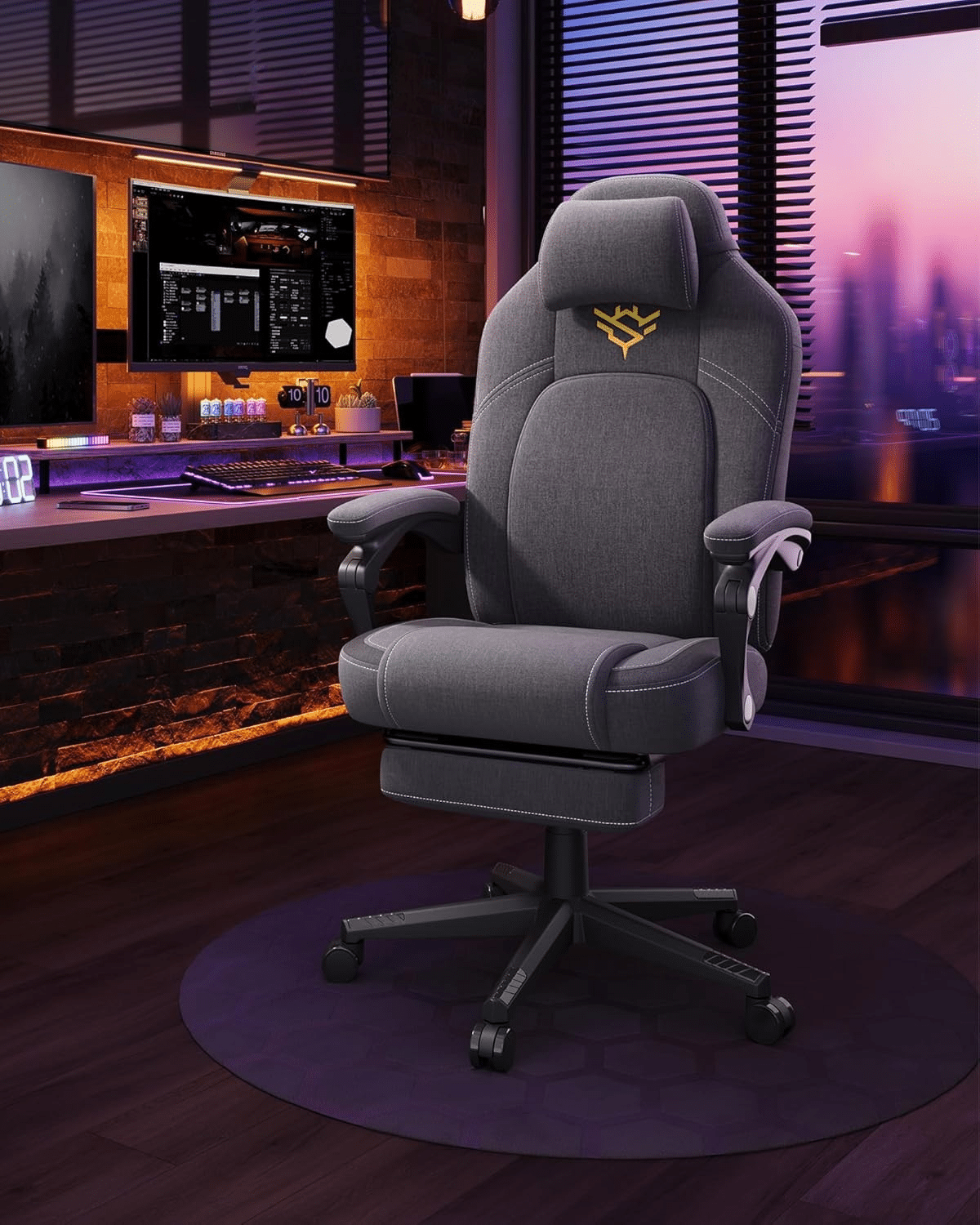 Uživajte u savršenom spoju stila i funkcionalnosti uz gejmersku stolicu brenda. Ova moderna kompjuterska stolica kombinuje elegantnu površinu od pamuka i lana sa atraktivnim zlatnim detaljima, unoseći dozu luksuza u svaki gejming ili radni prostor.