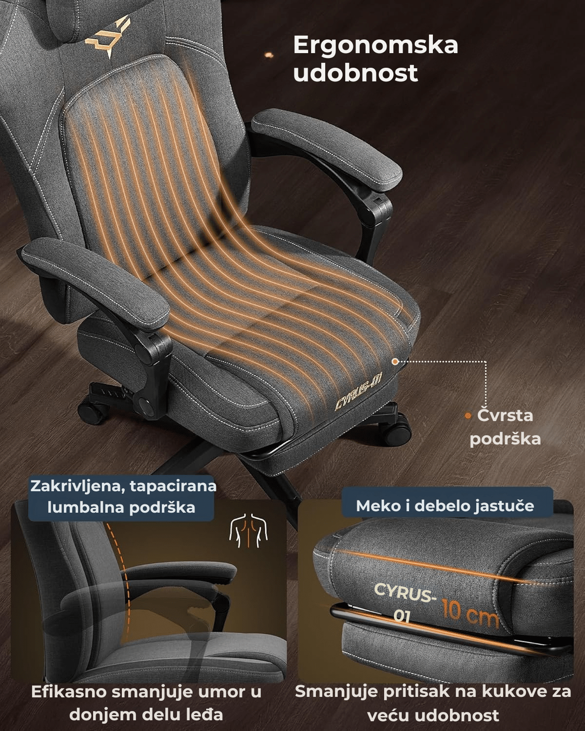 Ergonomska podrška je na vrhunskom nivou – naslon se savršeno prilagođava telu, dok bogato punjena lumbalna podrška, mekano sedište, nasloni za ruke sa sinhronim mehanizmom i dodatni jastuk obezbeđuju potpunu udobnost i stabilnost tokom dugotrajnog sedenja.