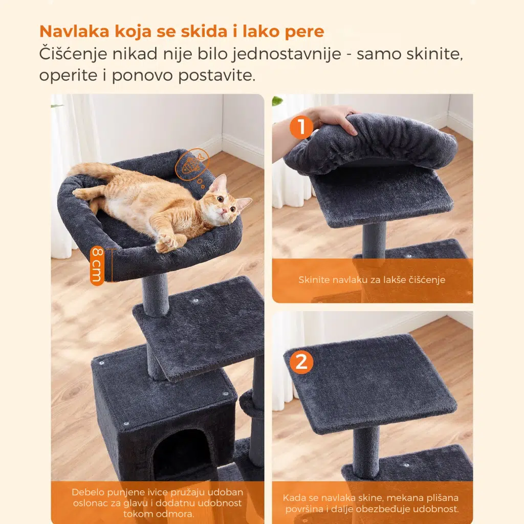 Navlake sa gornje platforme mogu se skinuti radi lakšeg čišćenja (preporuka: ručno pranje), što omogućava da prostor vaše mačke uvek bude čist i higijenski.