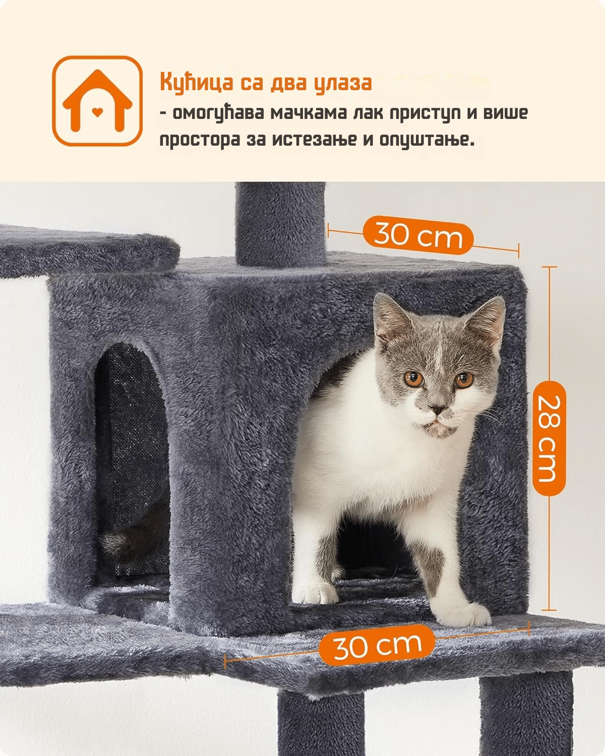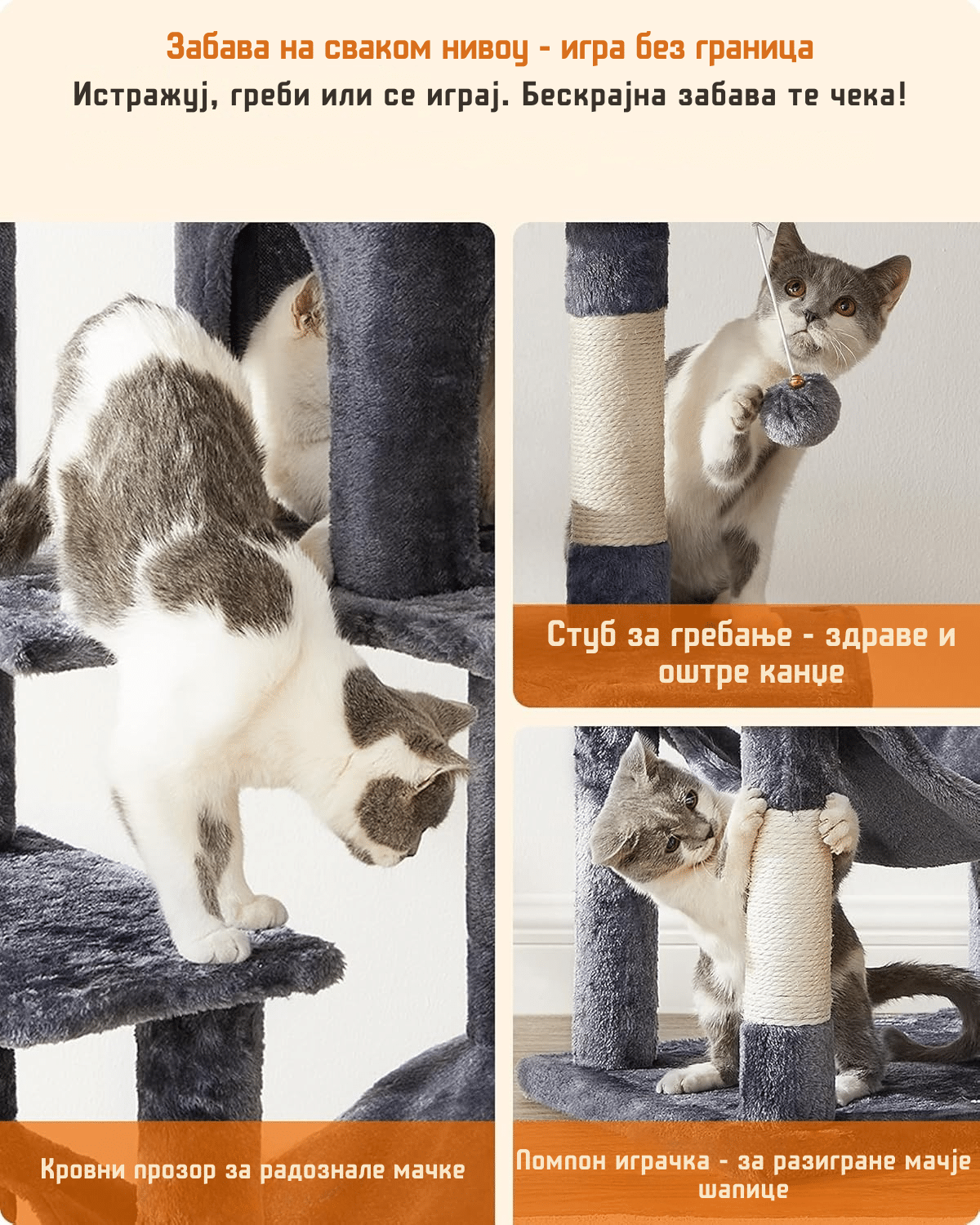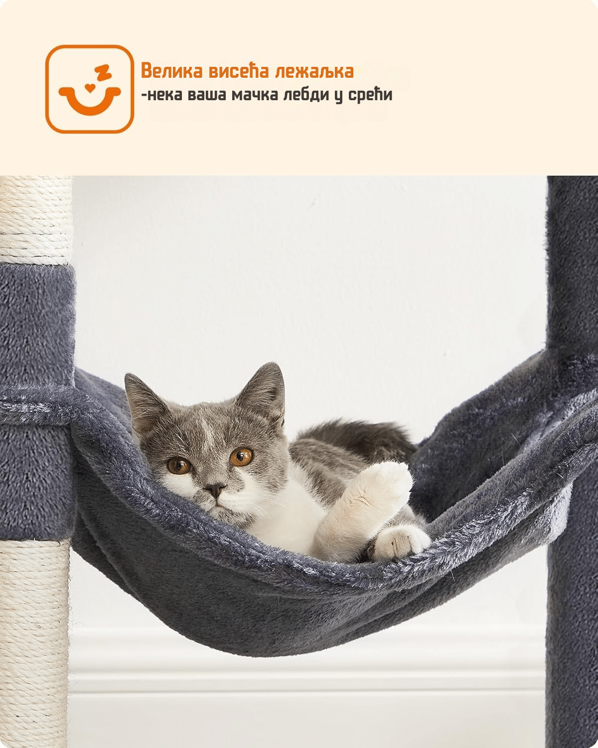 „Drvo?“ Da, mačići, nije san! Znamo da volite da gledate kroz prozor u drveće. Sada imate i svoje drvo za grebanje. Udobna kućica u stablu pruža vam topao kutak gde možete da se povučete i odmorite.