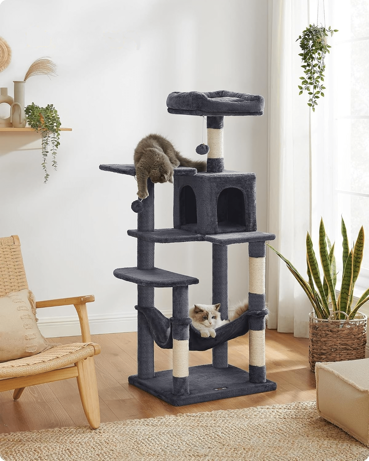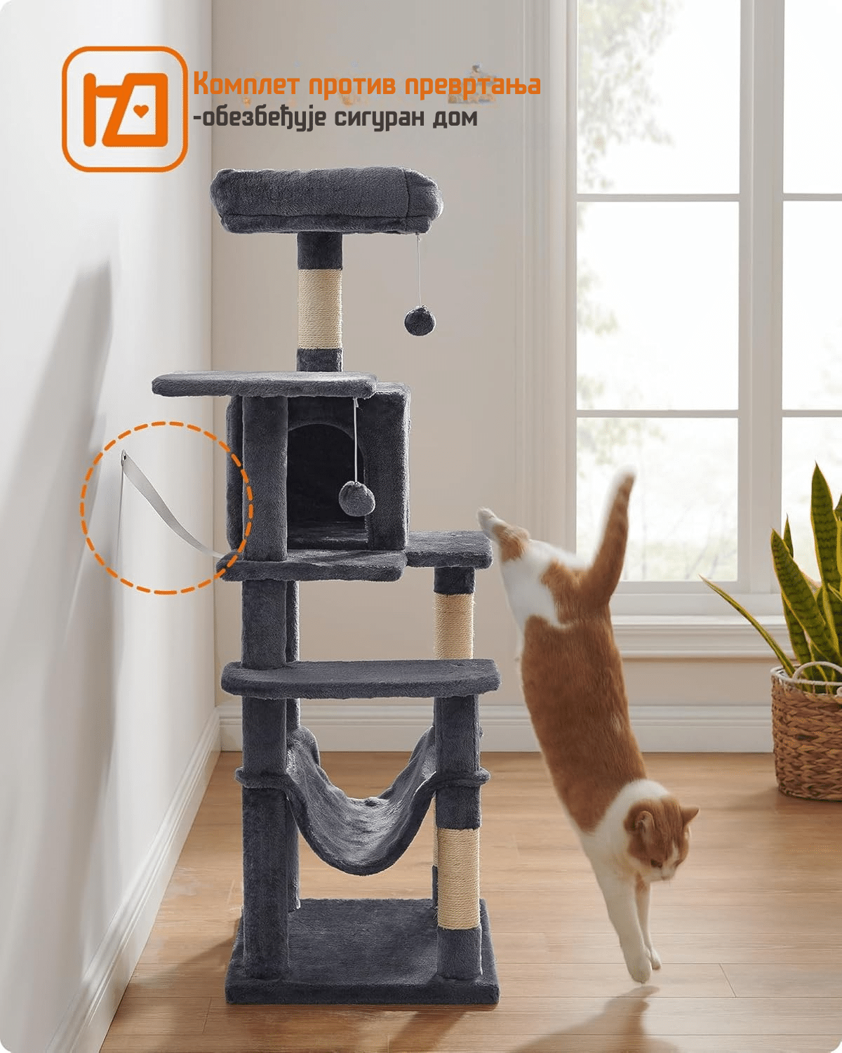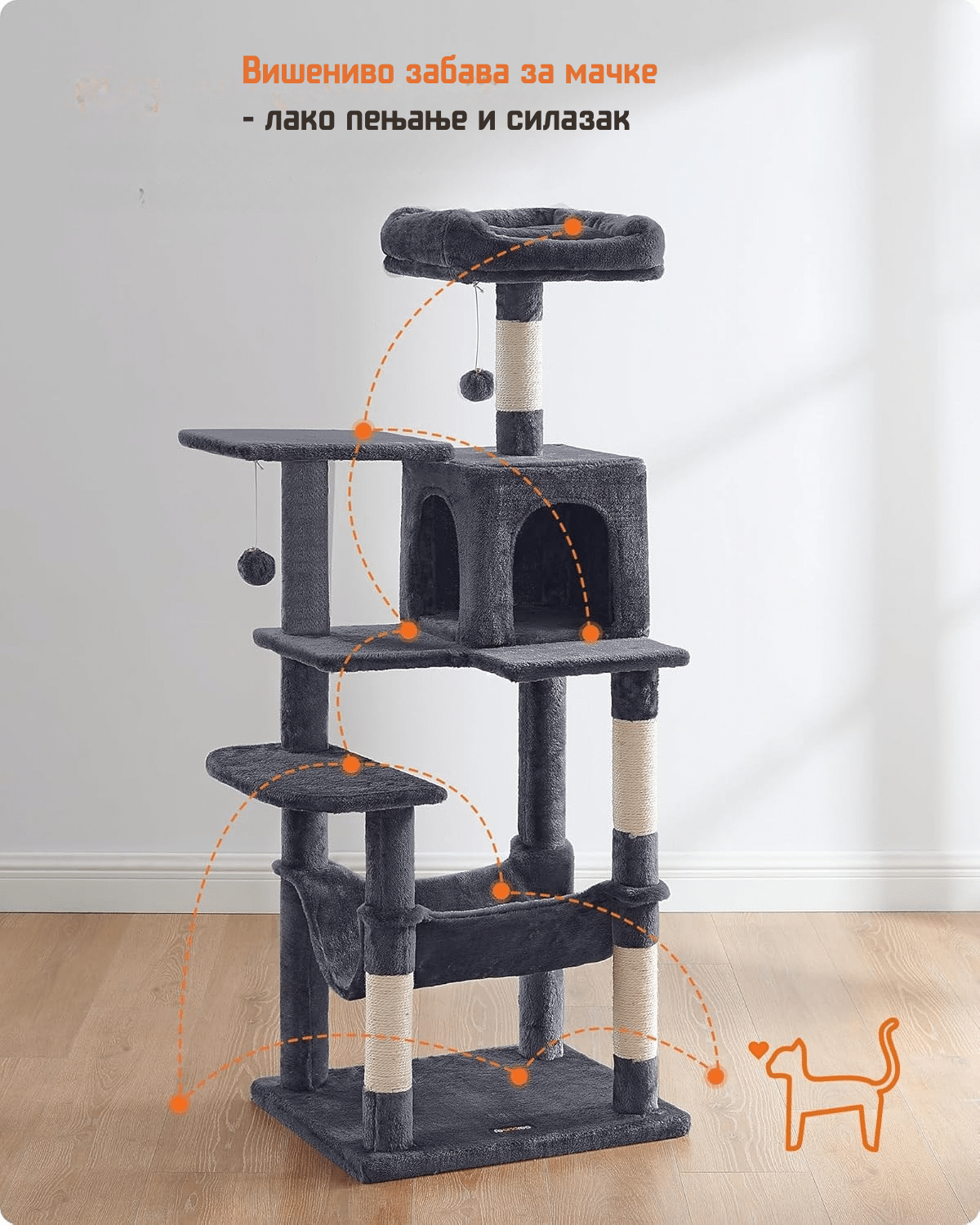 „Drvo?“ Da, mačići, nije san! Znamo da volite da gledate kroz prozor u drveće. Sada imate i svoje drvo za grebanje. Udobna kućica u stablu pruža vam topao kutak gde možete da se povučete i odmorite.