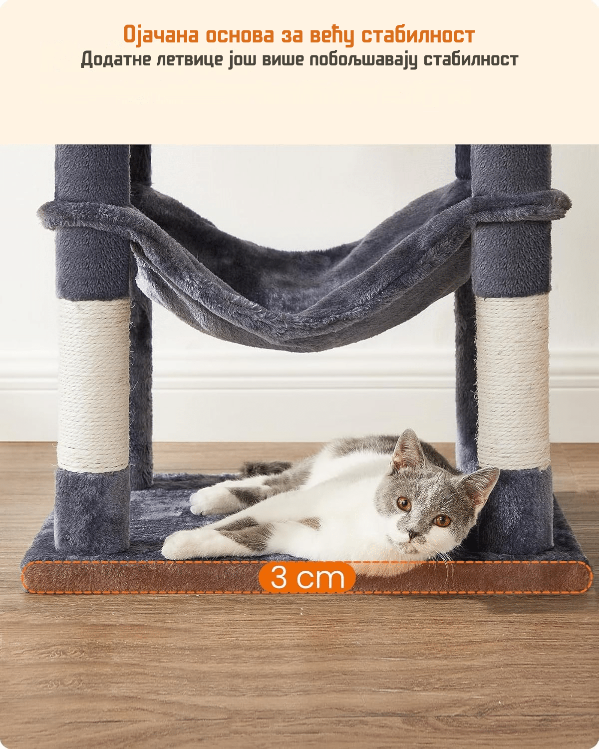 Divlje skakanje okolo? Nema problema! Sa ojačanom osnovnom pločom i dodatnom zaštitom od prevrtanja, ova grebalica nudi još veću stabilnost, tako da možete da se izigrate do mile volje. Možete čak i da pozovete dva mačja druga (svaki do 5 kg).