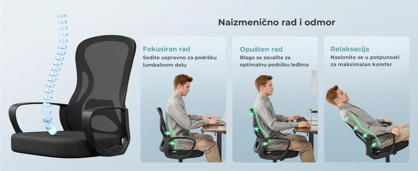 Podesiva visina sedišta omogućava prilagođavanje različitim korisnicima. Funkcija ljuljanja (90–105°) pruža dodatnu udobnost i opuštanje tokom pauza.