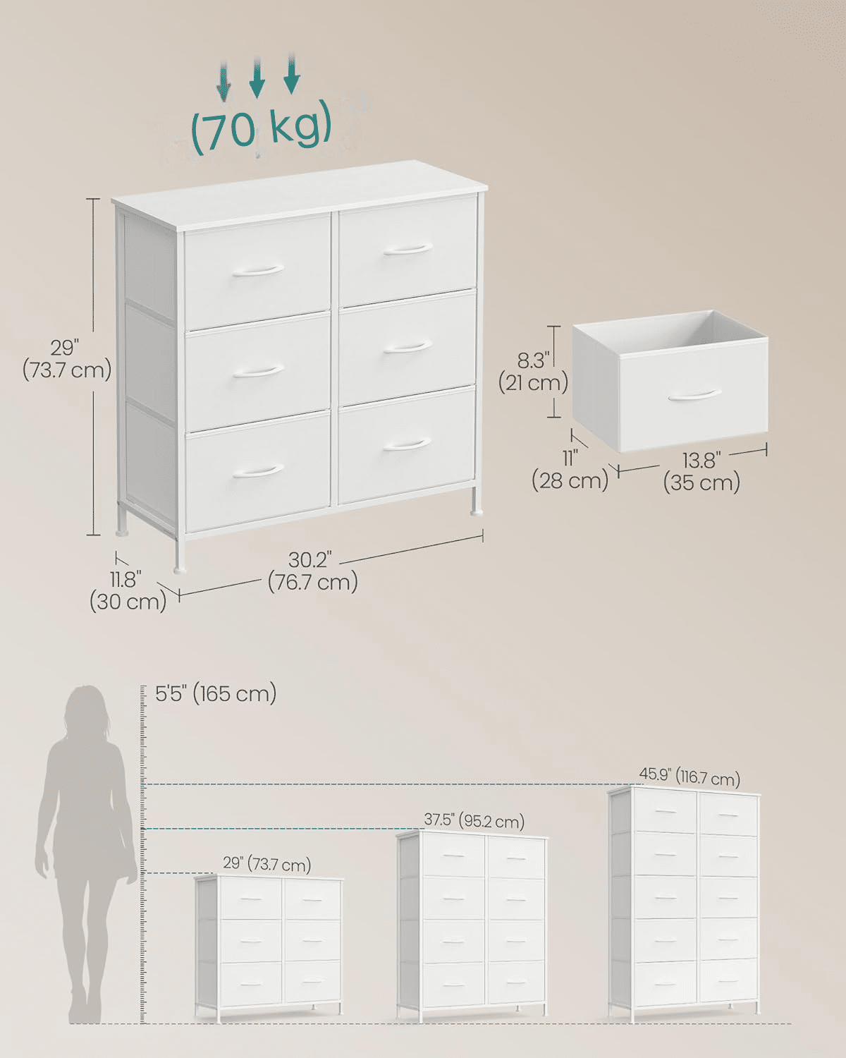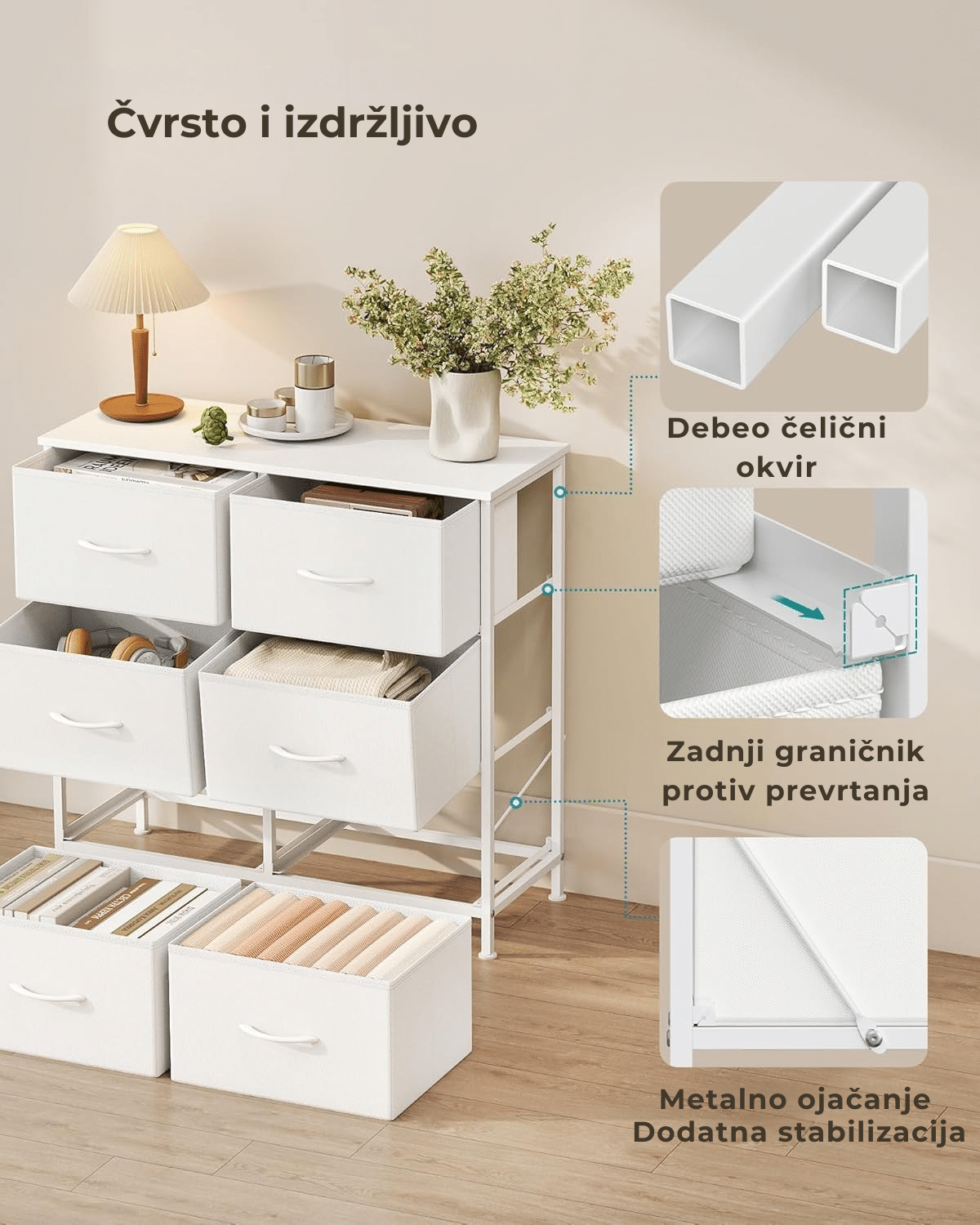 Čvrsta konstrukcija – izrađena od čeličnog okvira, iverice i fioka od netkanog materijala sa MDF ojačanjem, ova komoda je stabilna i dugotrajna. Gornja ploča nosi do 40 kg, a svaka fioka do 5 kg.