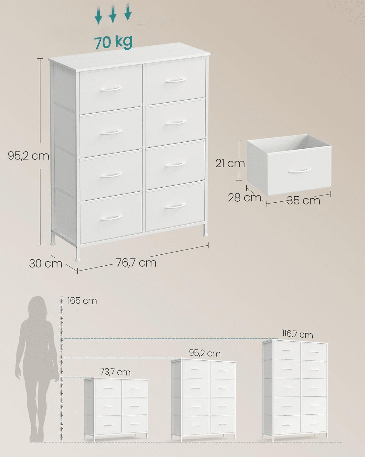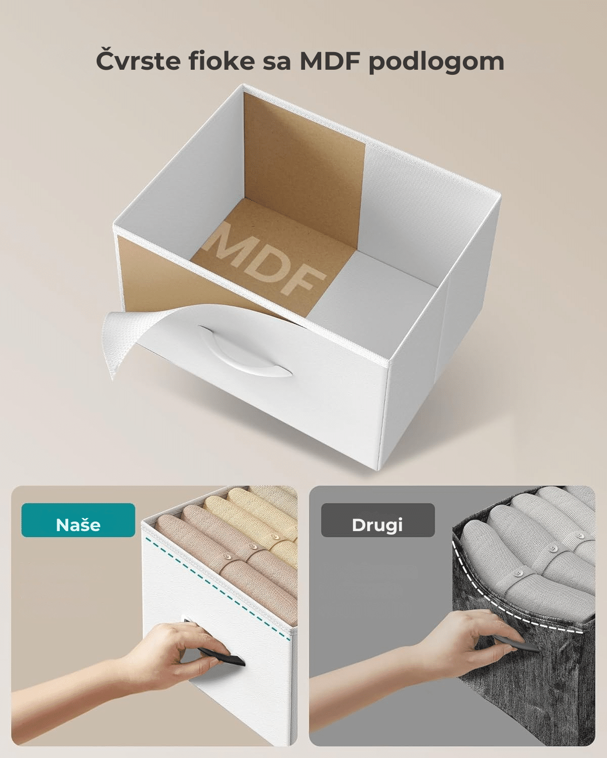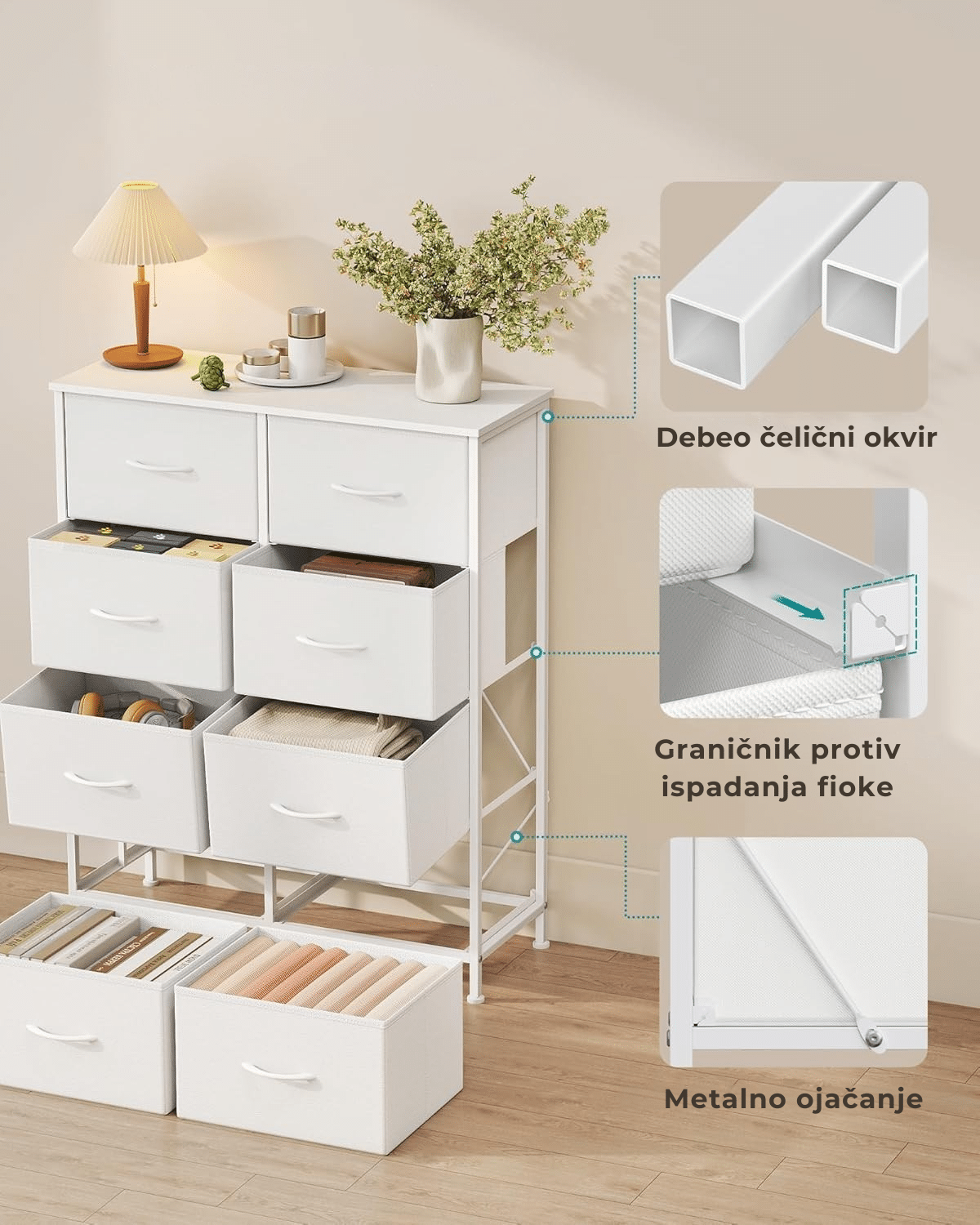 Čvrsta konstrukcija – izrađena od čeličnog okvira, iverice i fioka od netkanog materijala sa MDF ojačanjem, ova komoda je stabilna i dugotrajna. Gornja ploča nosi do 30 kg, a svaka fioka do 5 kg.
