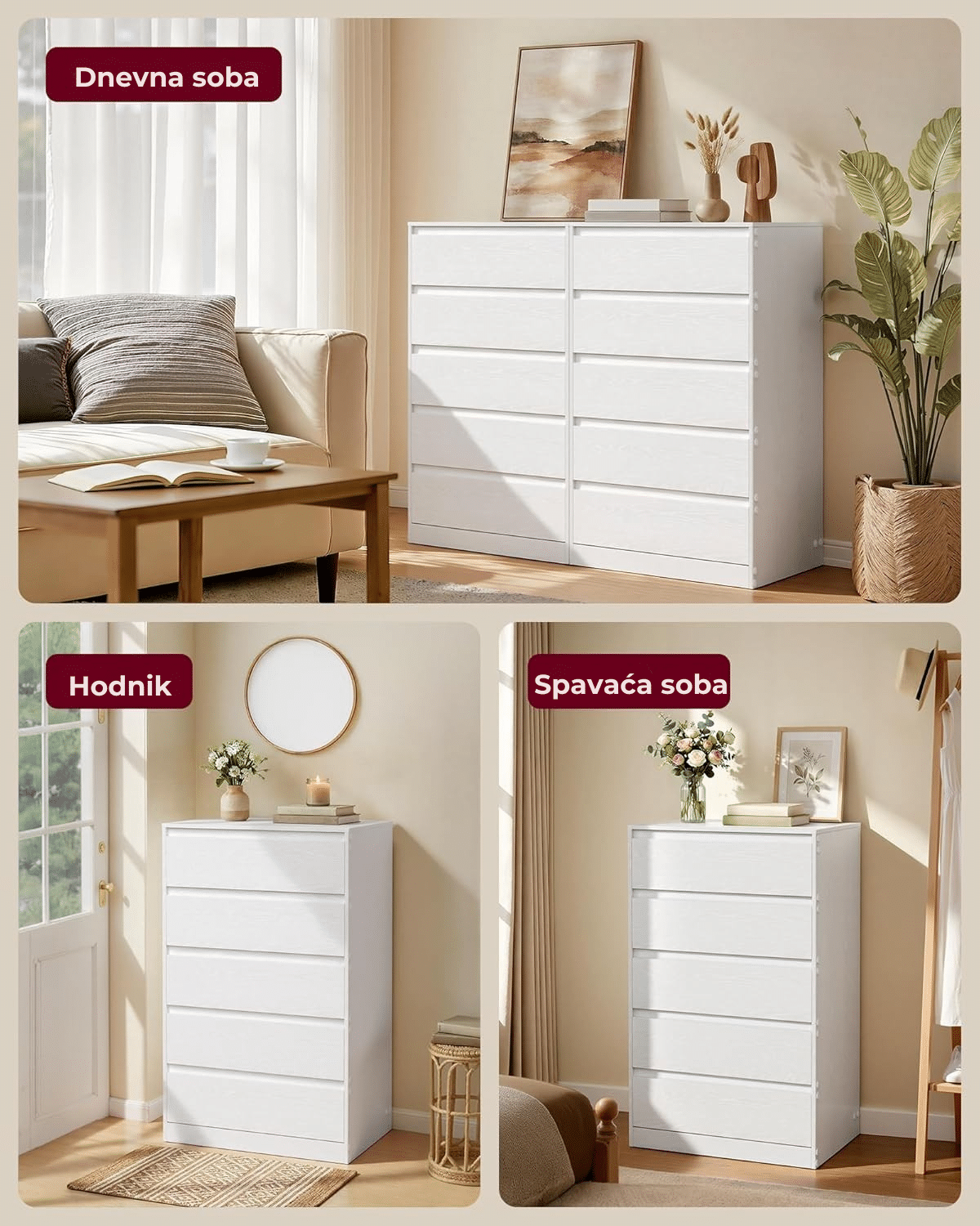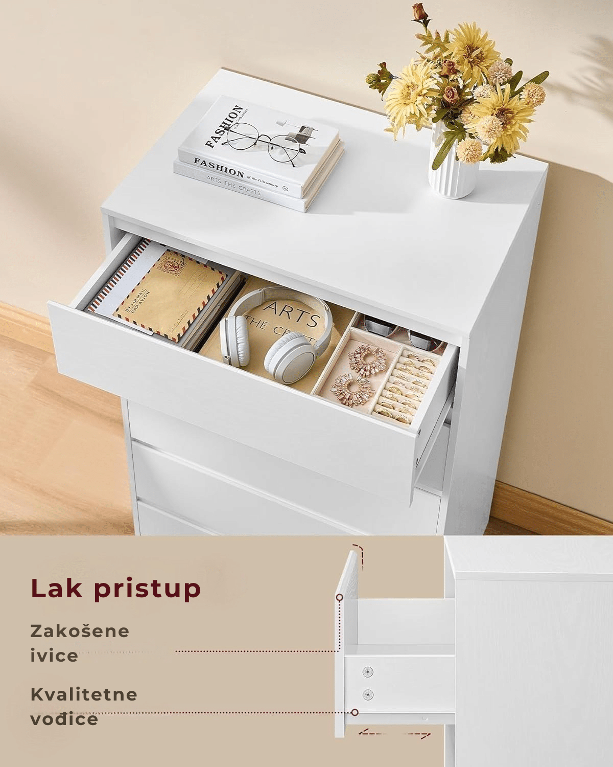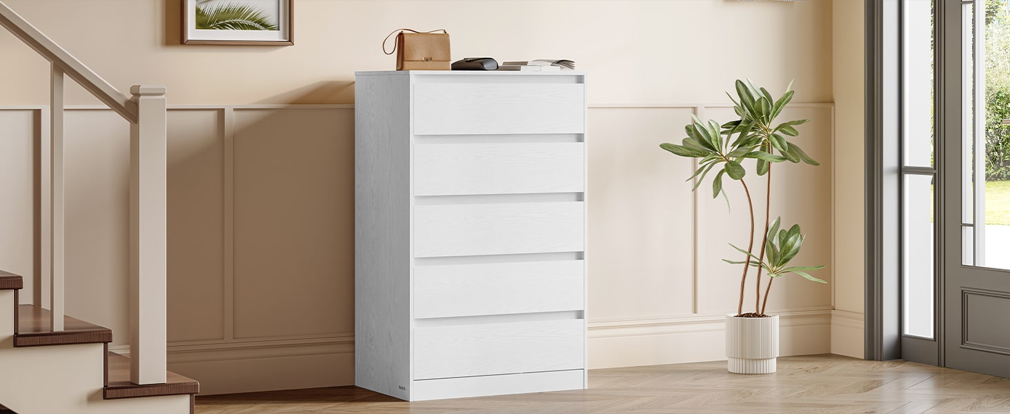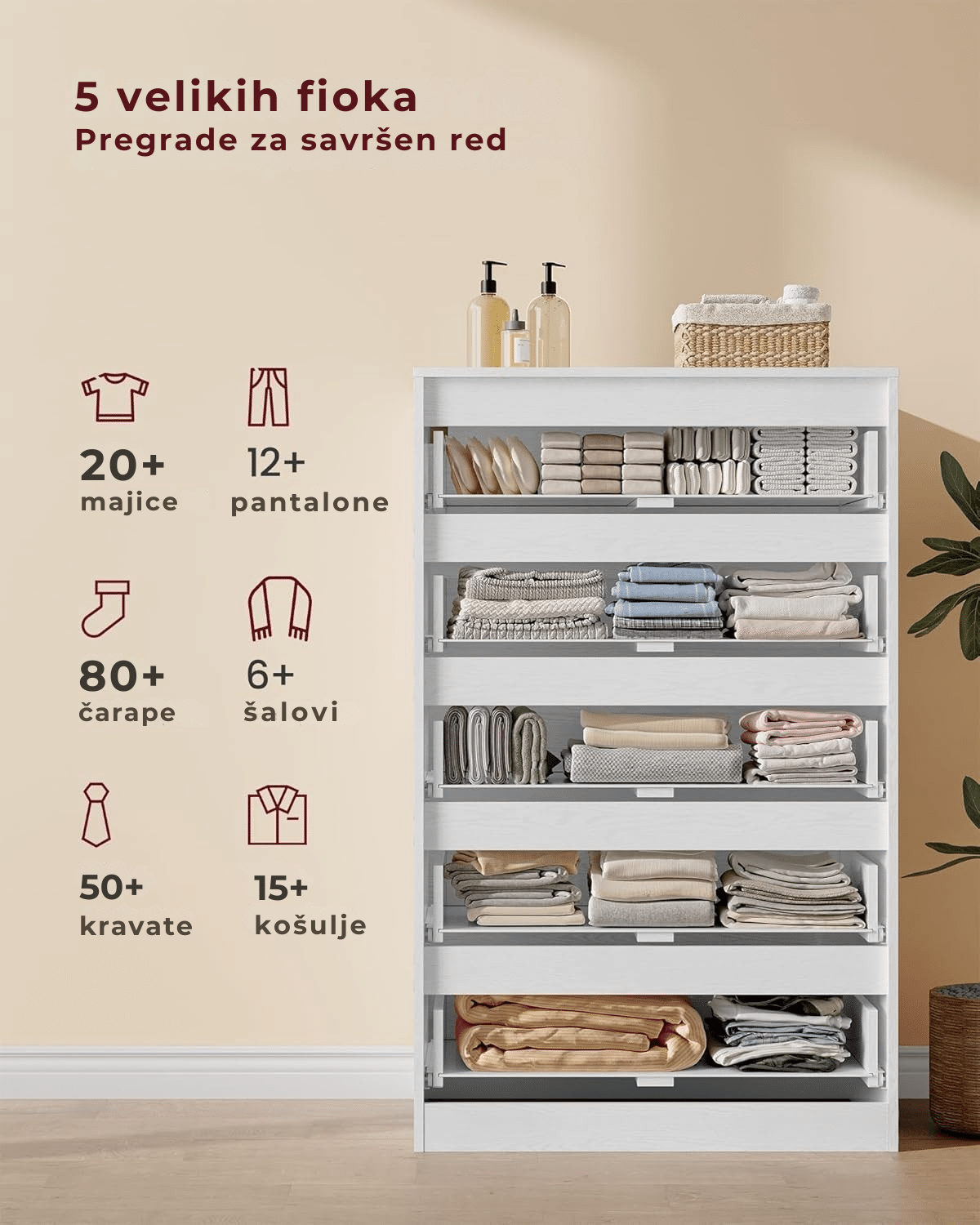 Ova komoda sa 5 fioka omogućava vam da organizujete i odložite odeću, dokumenta, aksesoare i druge stvari, čineći vaš dom urednim i funkcionalnim.
