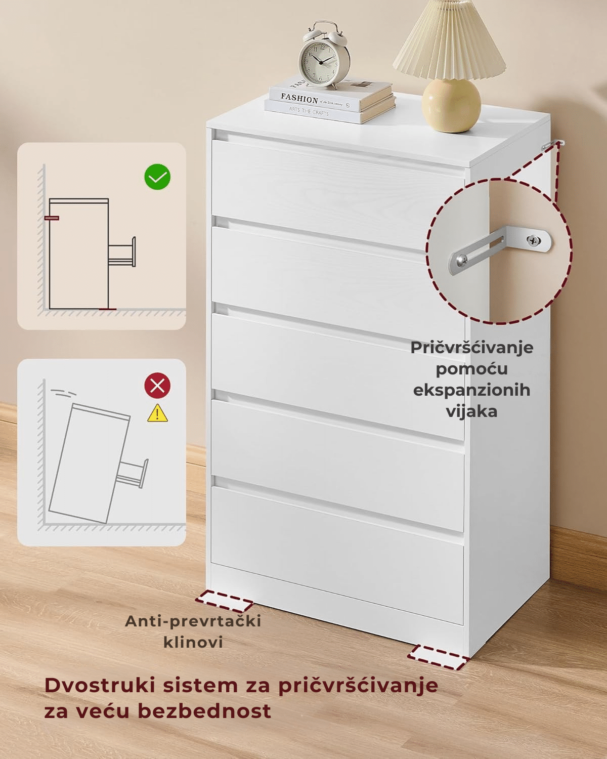 Izrađena od čvrste iverice i MDF-a, komoda dolazi sa 2 anti-tip kompleta za pričvršćivanje uz zid, što obezbeđuje dodatnu stabilnost i sigurnije okruženje u vašem domu.