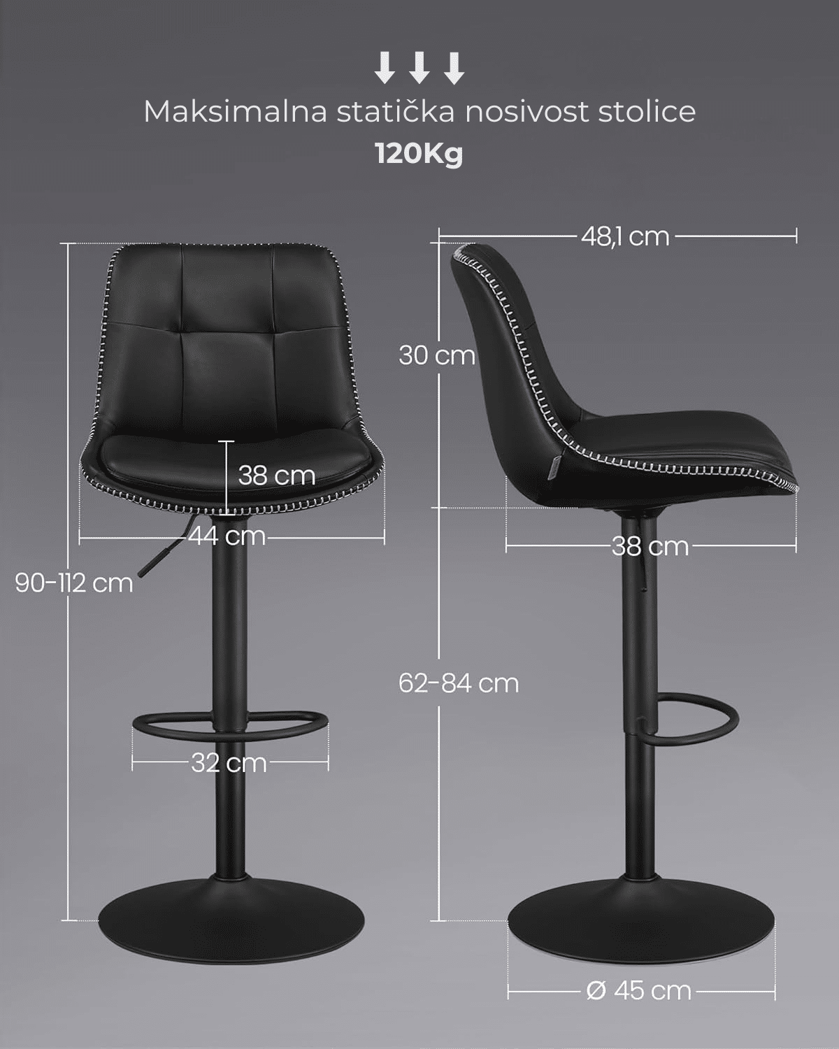 Kvalitetan gasni mehanizam, čelični ram sa hromiranom završnicom i čvrsto postolje prečnika 45 cm omogućavaju nosivost do 120 kg. Čak i pri rotaciji od 360°, stolica ostaje stabilna i bezbedna.