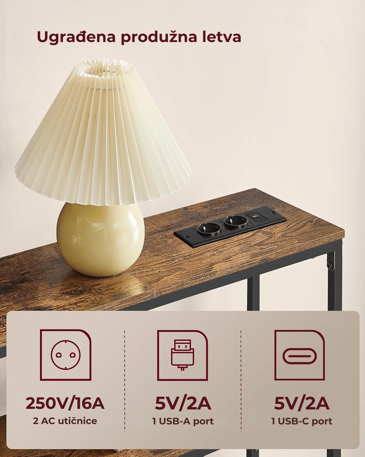 Sa 2 AC utičnice, 1 USB-A i 1 USB-C portom, ovaj konzolni sto omogućava vam da istovremeno punite lampu, telefon, tablet ili čak dekorativna svetla.