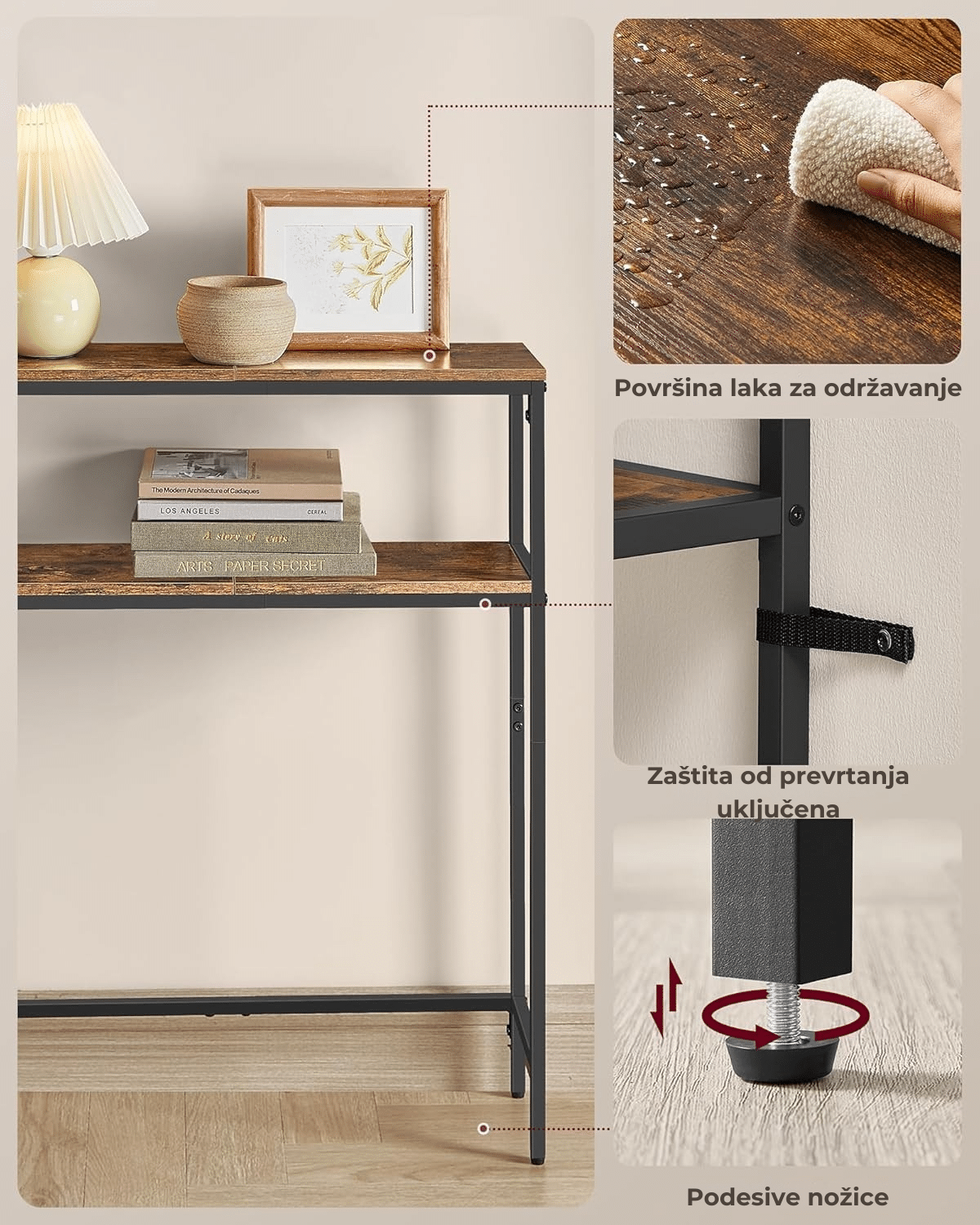 Izrađen od kvalitetne iverice i čeličnog okvira, sto nosi do 30 kg na gornjoj i 20 kg na donjoj polici. Podesive nožice obezbeđuju stabilnost i sprečavaju ljuljanje.