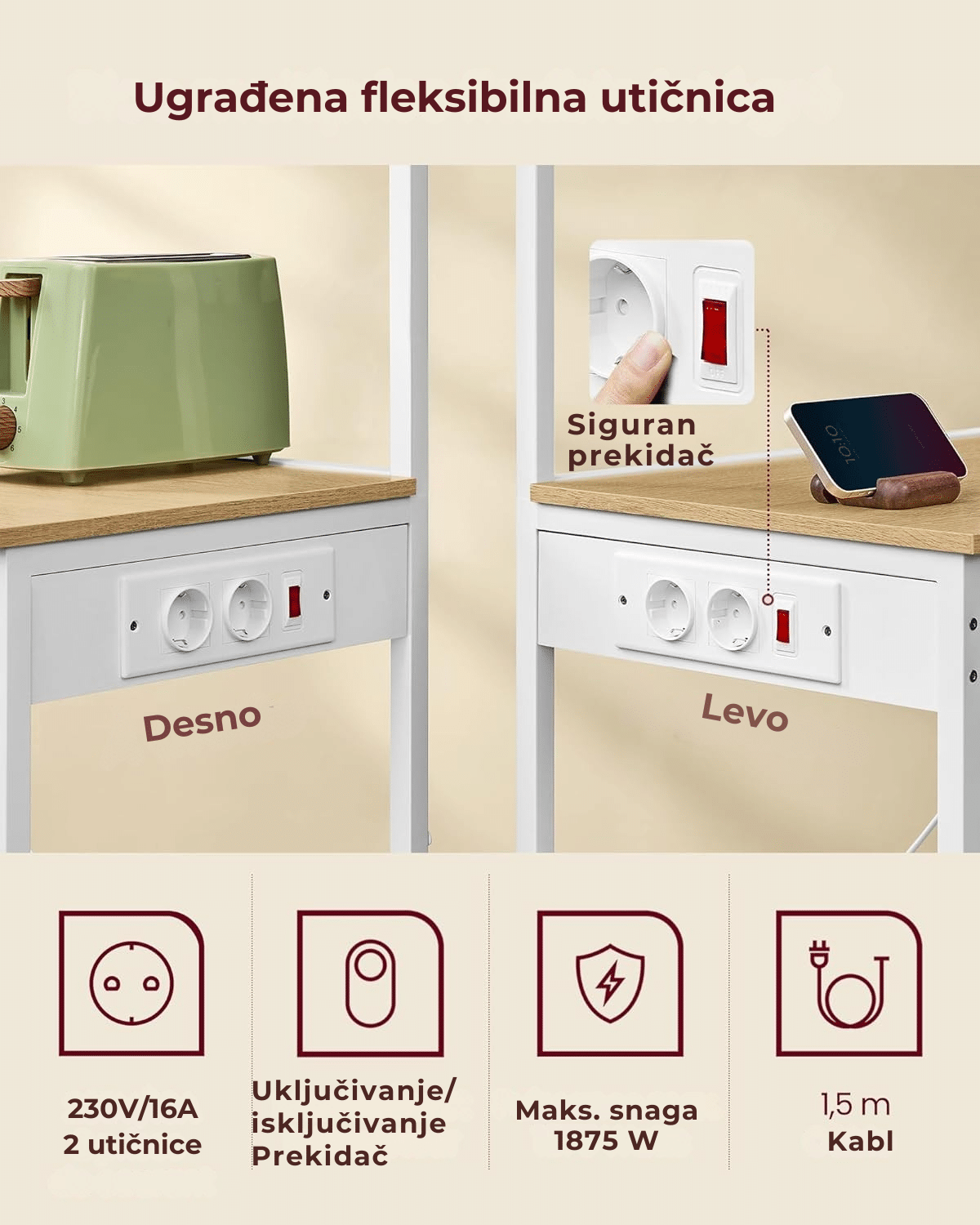 Praktična i sigurna utičnica – opremljena ugrađenim produžnim kablom sa 2 AC priključka za jednostavno napajanje uređaja. Prekidač za uključivanje/isključivanje i zaštita od preopterećenja obezbeđuju maksimalnu sigurnost.