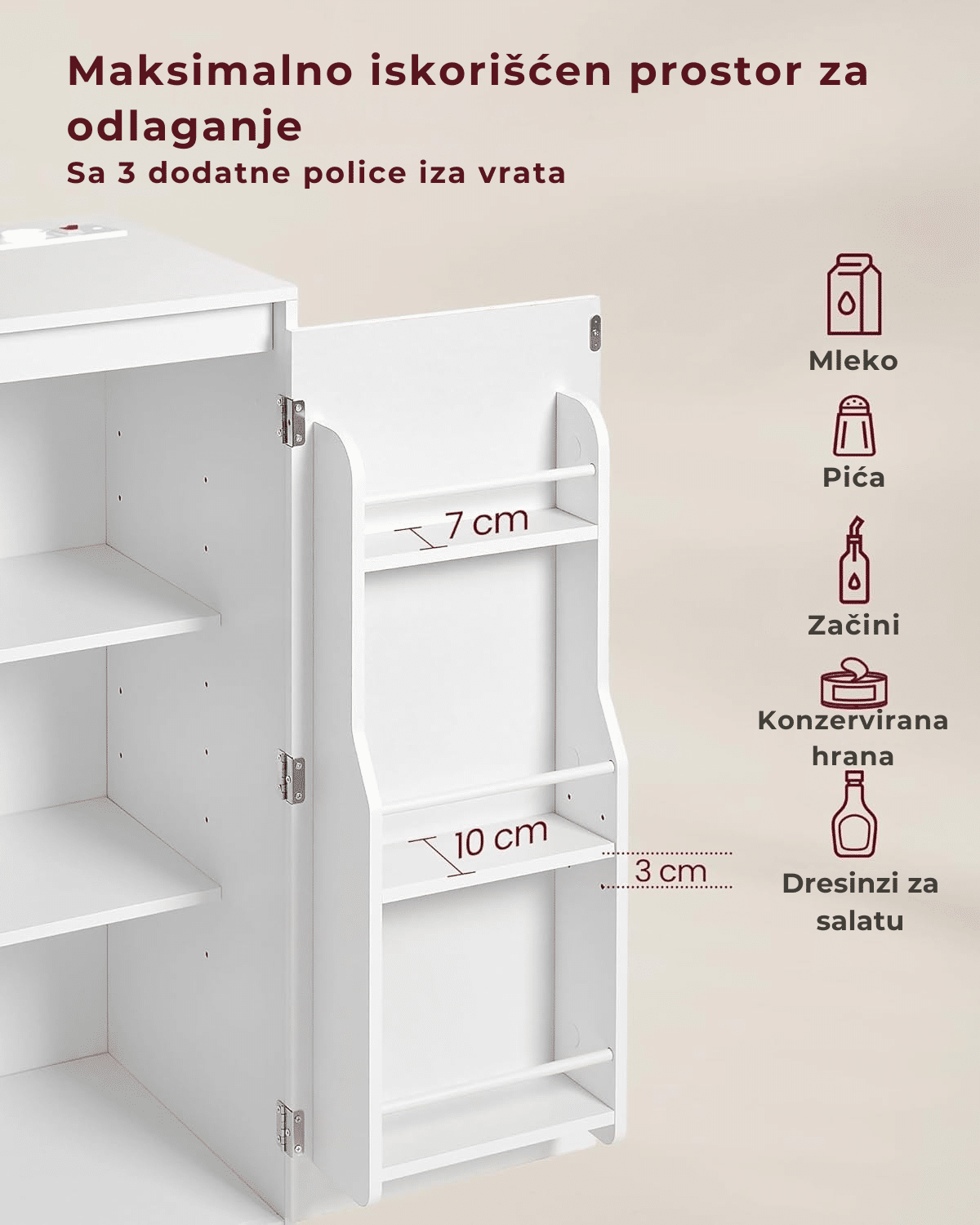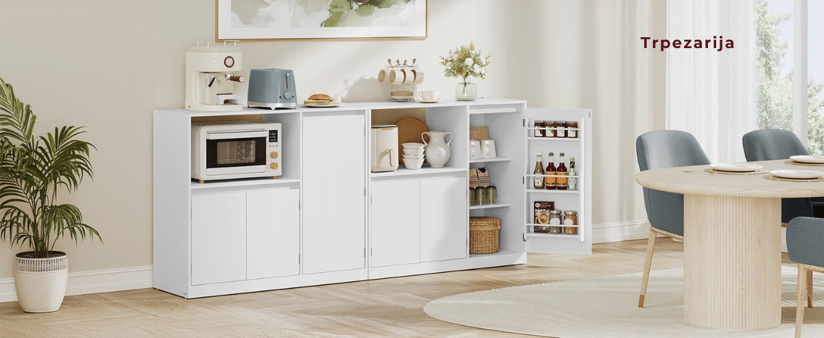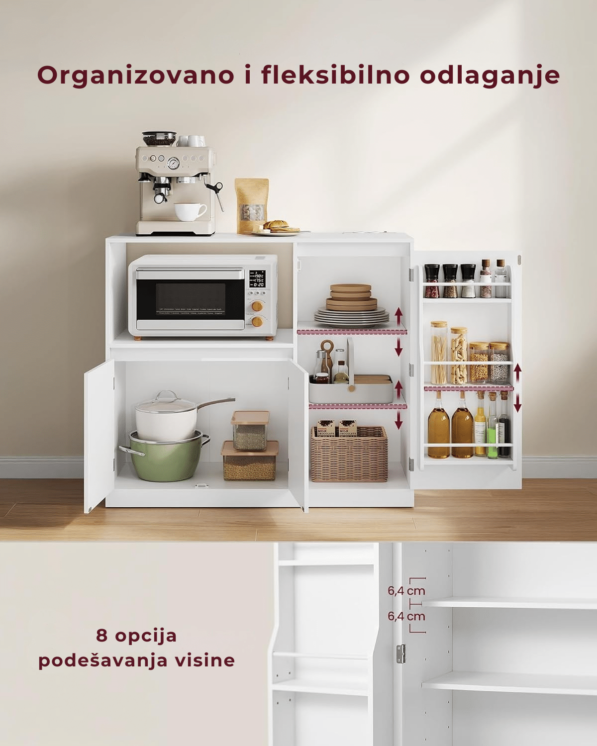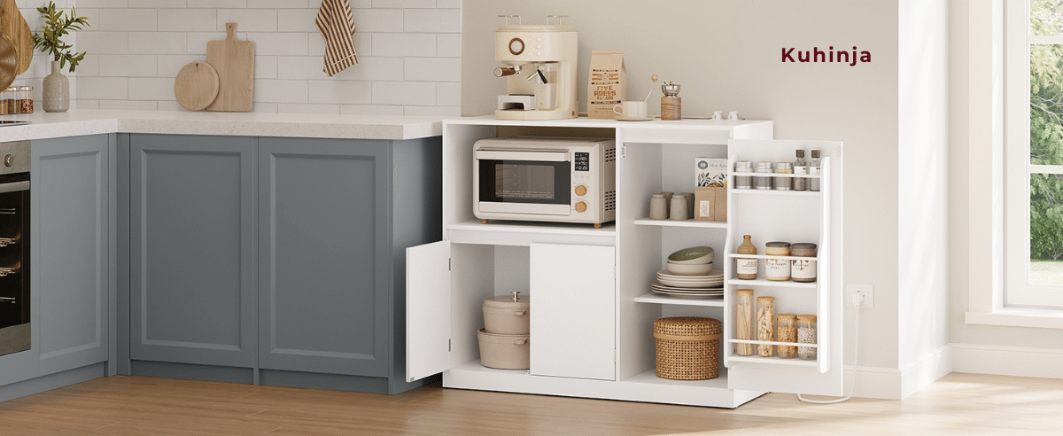 Otvoreni odeljak dimenzija 53 x 35 x 40 cm idealan je za mikrotalasnu. Tu su i 3 police na vratima, 2 podesive police unutar ormarića, kao i zatvoreni donji deo za stvari koje ređe koristite.