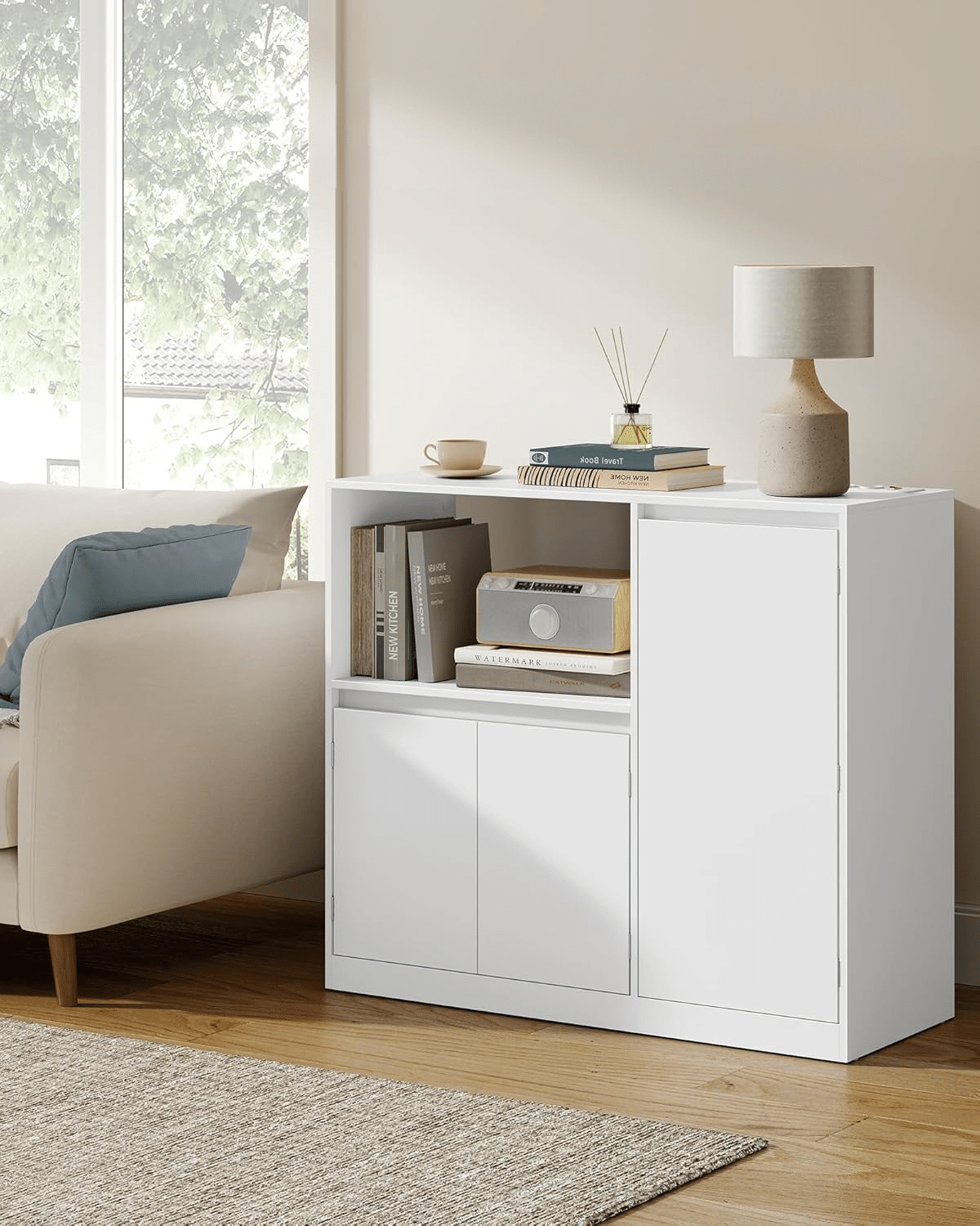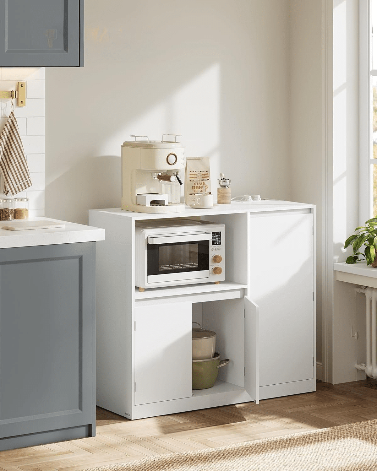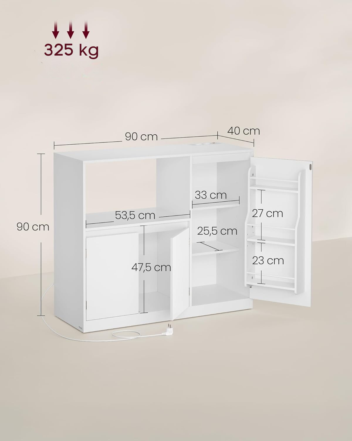 Otvoreni odeljak dimenzija 53 x 35 x 40 cm idealan je za mikrotalasnu. Tu su i 3 police na vratima, 2 podesive police unutar ormarića, kao i zatvoreni donji deo za stvari koje ređe koristite.