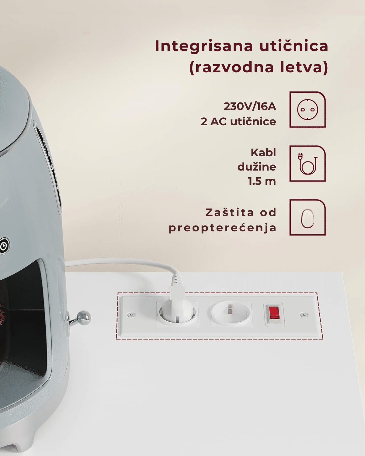 Ugrađena razvodna letva sa zaštitom od preopterećenja omogućava istovremeno korišćenje više uređaja. Otvor za kablove na zadnjem delu omogućava uredno i sigurno organizovanje kablova.