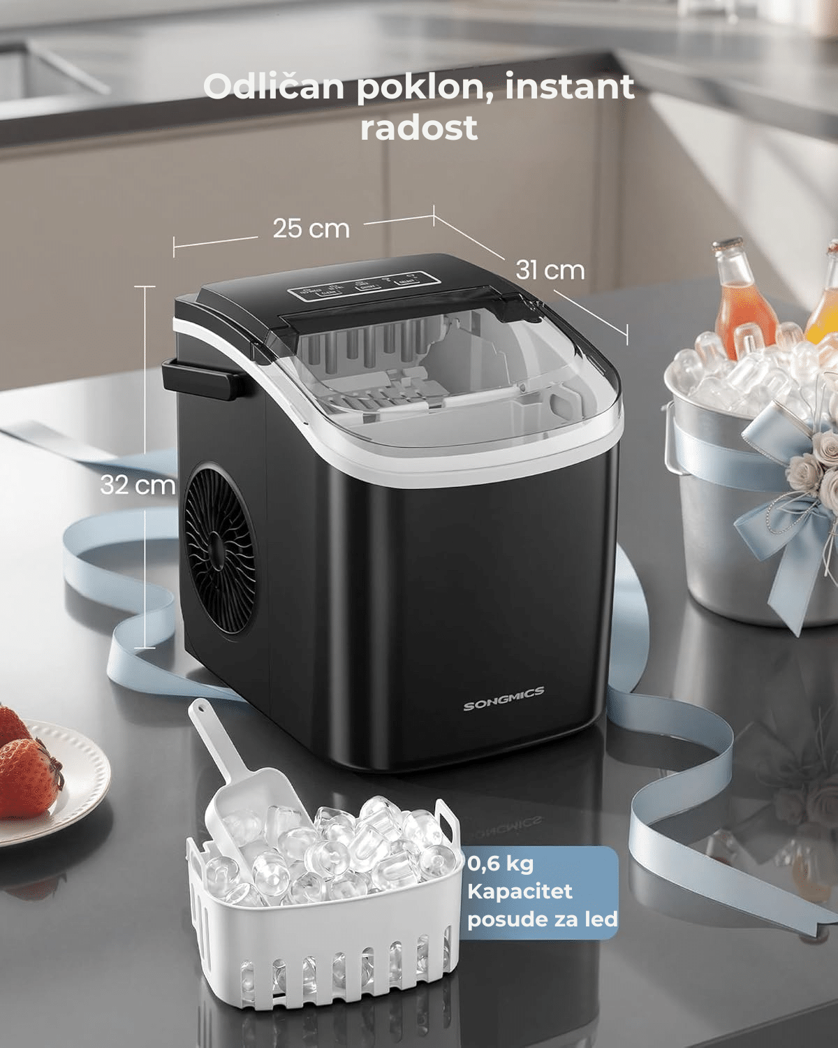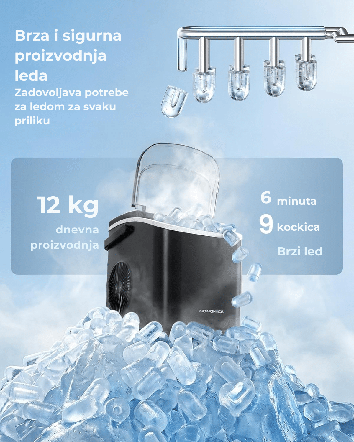 Brz led kada vam zatreba – ovaj kompaktni aparat proizvodi 9 kockica leda za samo 6 minuta, uz kapacitet do 12 kg u 24 sata. Sa posudom od 0,6 kg, idealan je za kućni bar, roštilje, kancelariju, zabave i porodična okupljanja.